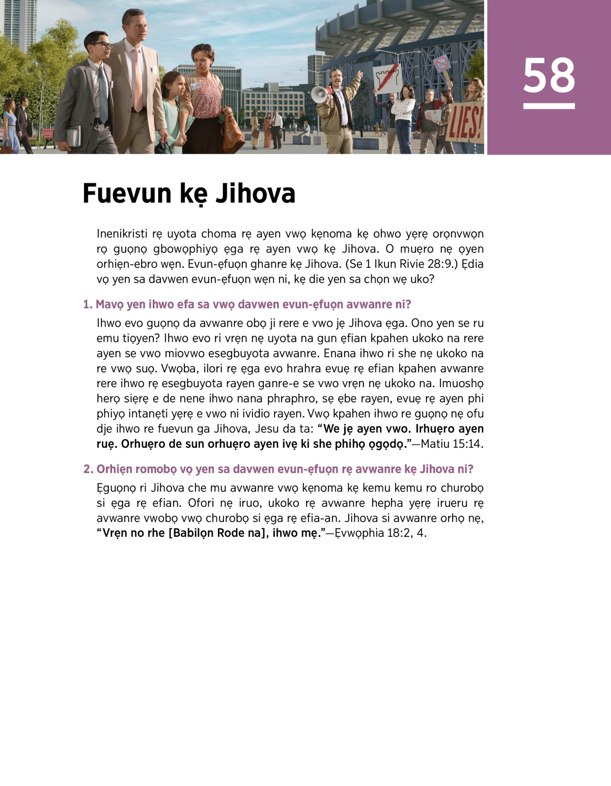Yono kpahen obo wọ sa vwọ kẹnoma kẹ ihwo re guọnọ nẹ wọ fuevun kẹ Jihova-a. Vwọba, mrẹ obo wọ sa vwọ fuevun kẹ Jihova womarẹ wo vwo vrẹn nẹ Babilọn Rode.