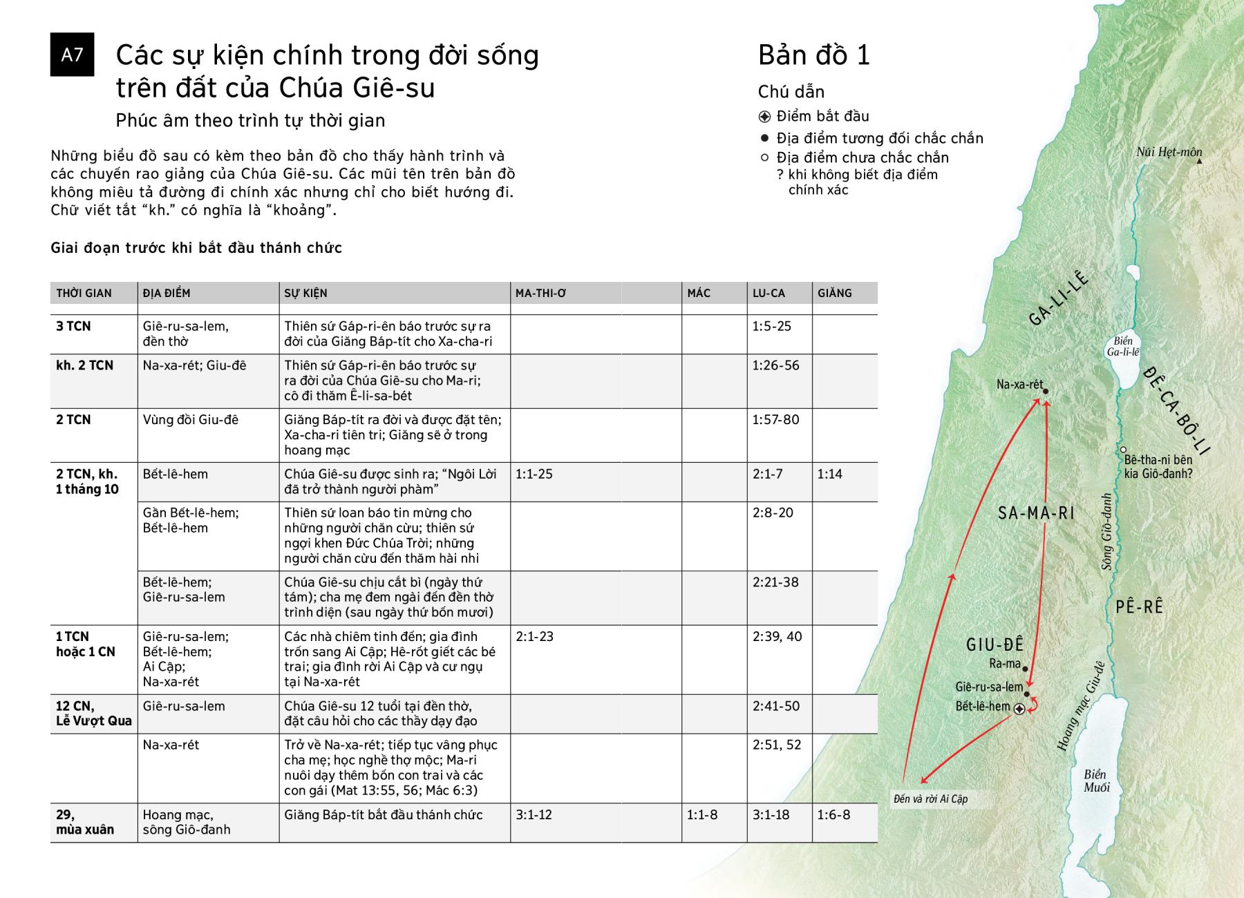 Những biểu đồ sau có kèm theo bản đồ cho thấy hành trình và các chuyến rao giảng của Chúa Giê-su. Các mũi tên trên bản đồ không miêu tả đường đi chính xác nhưng chỉ cho biết hướng đi. Chữ viết tắt “kh.” có nghĩa là “khoảng”.