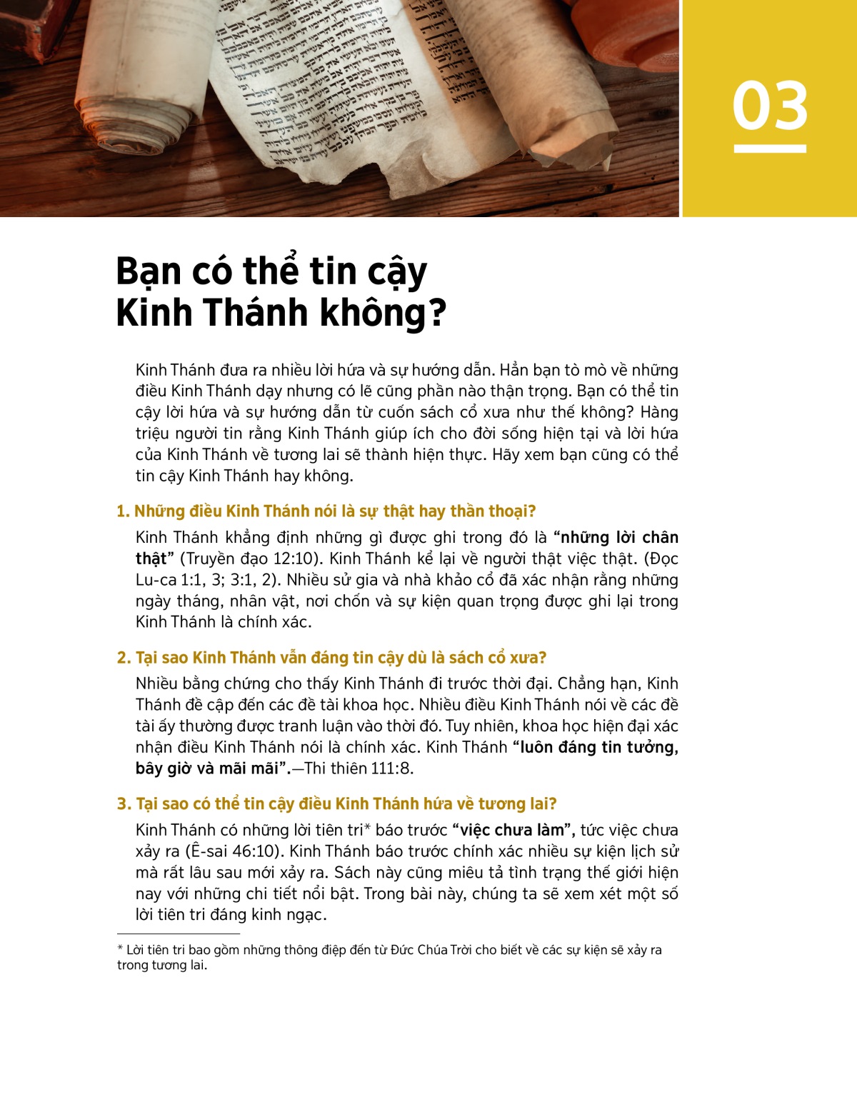Kinh Thánh đưa ra nhiều lời hứa và sự hướng dẫn. Hẳn bạn tò mò về những điều Kinh Thánh dạy nhưng có lẽ cũng phần nào thận trọng. Bạn có thể tin cậy lời hứa và sự hướng dẫn từ cuốn sách cổ xưa như thế không? Hàng triệu người tin rằng Kinh Thánh giúp ích cho đời sống hiện tại và lời hứa của Kinh Thánh về tương lai sẽ thành hiện thực. Hãy xem bạn cũng có thể tin cậy Kinh Thánh hay không.