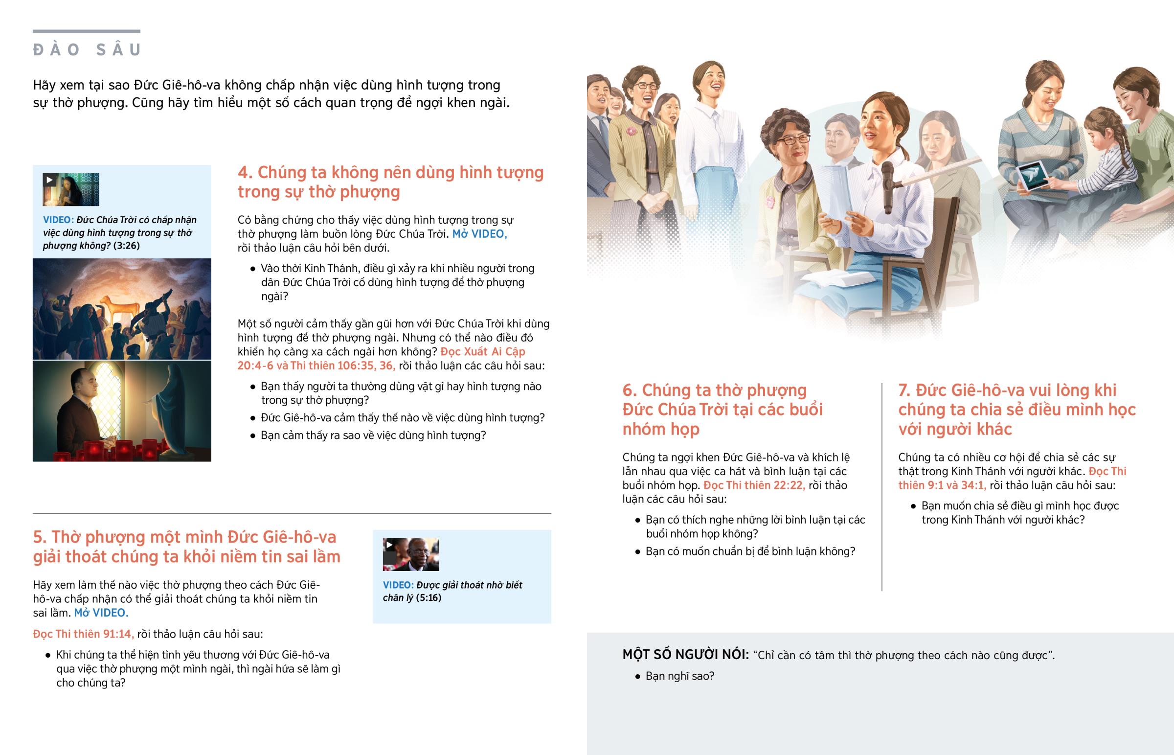 Một số người cảm thấy gần gũi hơn với Đức Chúa Trời khi dùng hình tượng để thờ phượng ngài. Nhưng có thể nào điều đó khiến họ càng xa cách ngài hơn không? Đọc Xuất Ai Cập 20:4-6 và Thi thiên 106:35, 36, rồi thảo luận các câu hỏi sau: