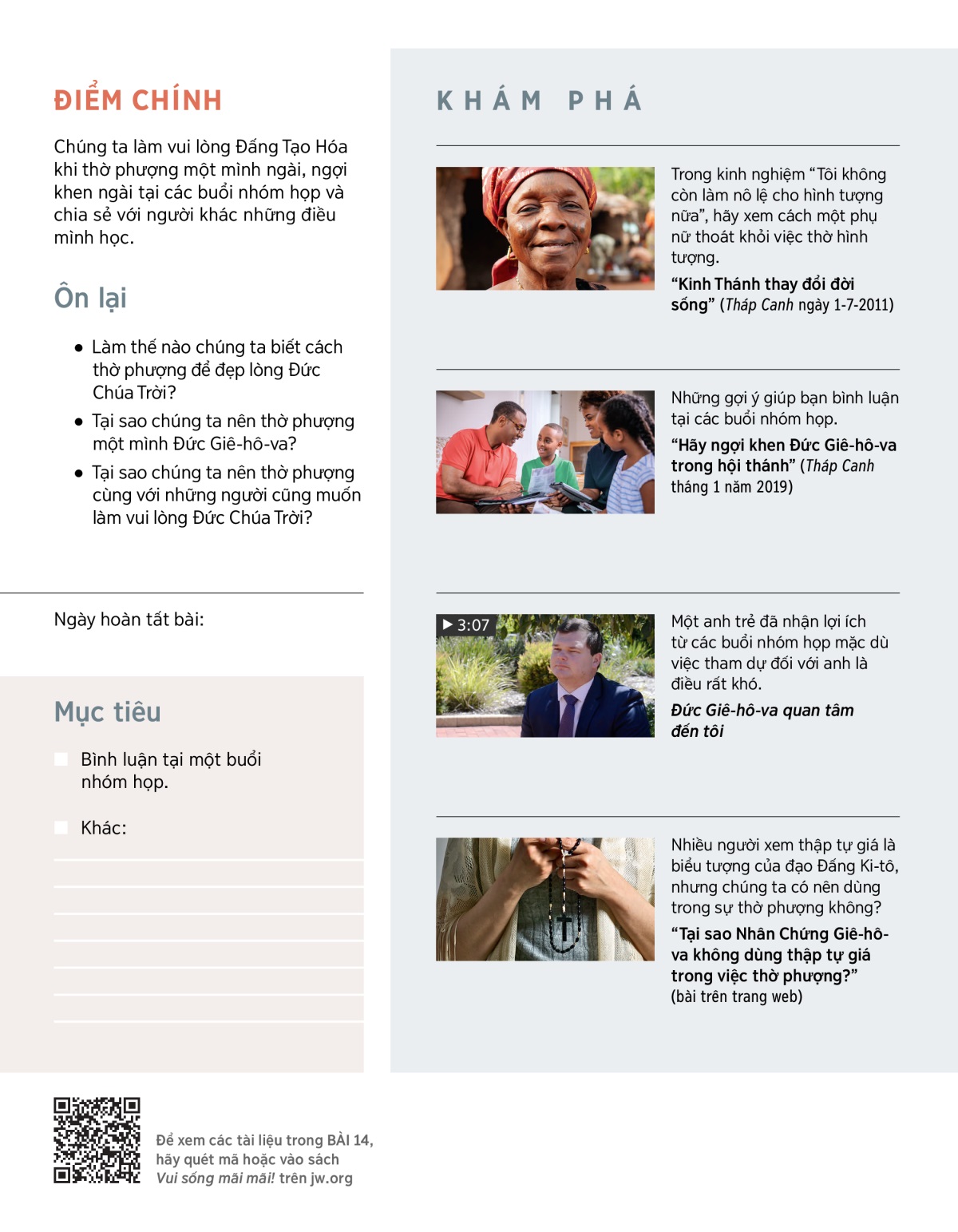 Chúng ta làm vui lòng Đấng Tạo Hóa khi thờ phượng một mình ngài, ngợi khen ngài tại các buổi nhóm họp và chia sẻ với người khác những điều mình học.