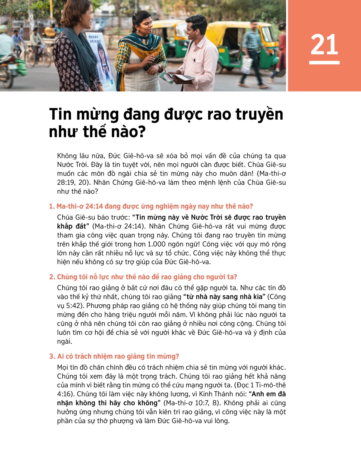 Không lâu nữa, Đức Giê-hô-va sẽ xóa bỏ mọi vấn đề của chúng ta qua Nước Trời. Đây là tin tuyệt vời, nên mọi người cần được biết. Chúa Giê-su muốn các môn đồ ngài chia sẻ tin mừng này cho muôn dân! (Ma-thi-ơ 28:19, 20). Nhân Chứng Giê-hô-va làm theo mệnh lệnh của Chúa Giê-su như thế nào?