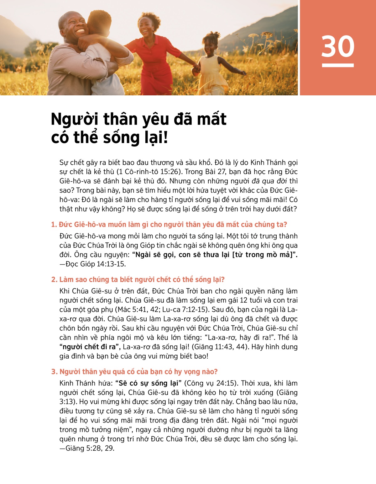 Sự chết gây ra biết bao đau thương và sầu khổ. Đó là lý do Kinh Thánh gọi sự chết là kẻ thù (1 Cô-rinh-tô 15:26). Trong Bài 27, bạn đã học rằng Đức Giê-hô-va sẽ đánh bại kẻ thù đó. Nhưng còn những người đã qua đời thì sao? Trong bài này, bạn sẽ tìm hiểu một lời hứa tuyệt vời khác của Đức Giê-hô-va: Đó là ngài sẽ làm cho hàng tỉ người sống lại để vui sống mãi mãi! Có thật như vậy không? Họ sẽ được sống lại để sống ở trên trời hay dưới đất?