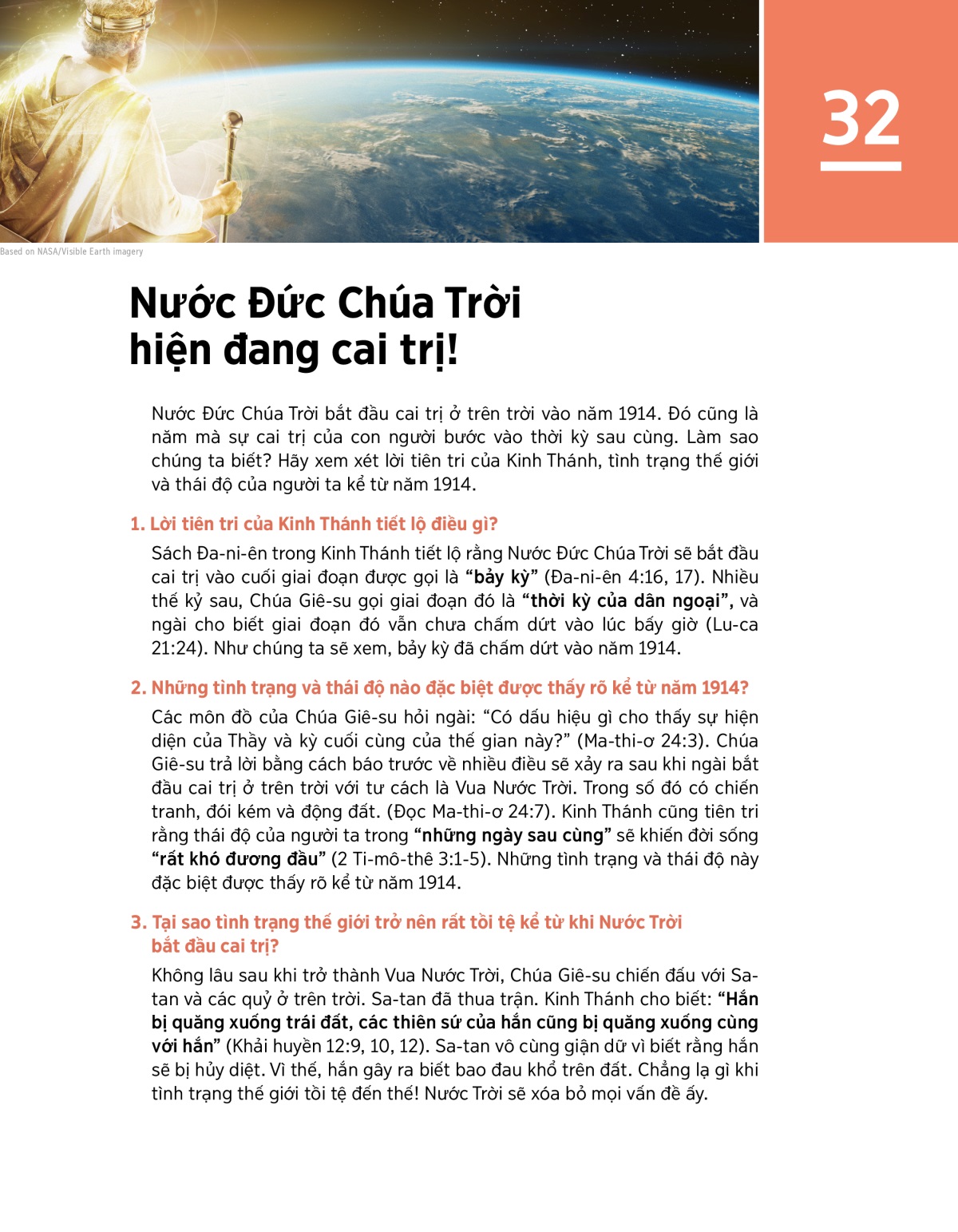 Các môn đồ của Chúa Giê-su hỏi ngài: “Có dấu hiệu gì cho thấy sự hiện diện của Thầy và kỳ cuối cùng của thế gian này?” (Ma-thi-ơ 24:3). Chúa Giê-su trả lời bằng cách báo trước về nhiều điều sẽ xảy ra sau khi ngài bắt đầu cai trị ở trên trời với tư cách là Vua Nước Trời. Trong số đó có chiến tranh, đói kém và động đất. (Đọc Ma-thi-ơ 24:7). Kinh Thánh cũng tiên tri rằng thái độ của người ta trong “những ngày sau cùng” sẽ khiến đời sống “rất khó đương đầu” (2 Ti-mô-thê 3:1-5). Những tình trạng và thái độ này đặc biệt được thấy rõ kể từ năm 1914.