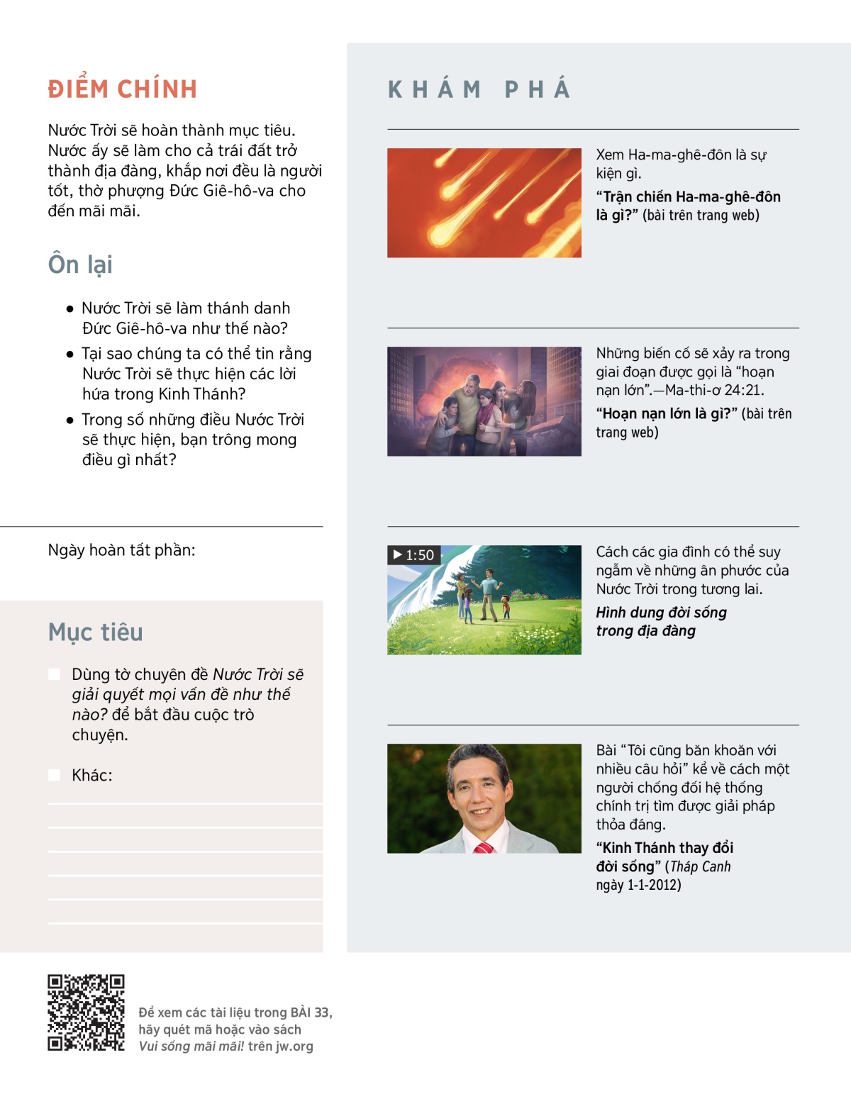 Nước Trời sẽ mang lại đời sống tuyệt diệu cho nhân loại như ý định ban đầu của Đức Giê-hô-va. Họ sẽ sống mãi trong địa đàng trên đất. Mở VIDEO để xem cách Đức Giê-hô-va đang thực hiện ý định của ngài qua Con ngài là Chúa Giê-su.