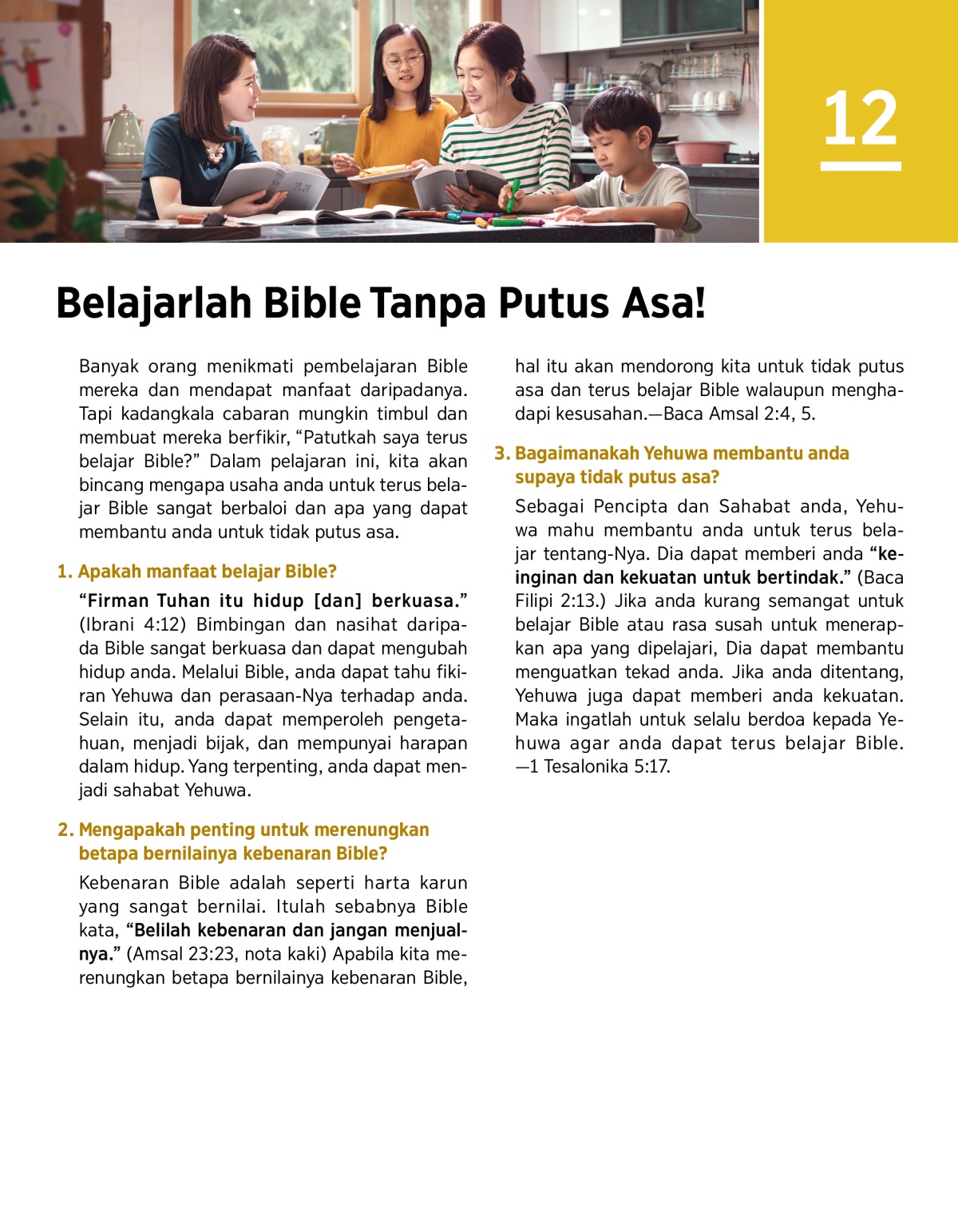 Banyak orang menikmati pembelajaran Bible mereka dan mendapat manfaat daripadanya. Tapi kadangkala cabaran mungkin timbul dan membuat mereka berfikir, “Patutkah saya terus belajar Bible?” Dalam pelajaran ini, kita akan bincang mengapa usaha anda untuk terus belajar Bible sangat berbaloi dan apa yang dapat membantu anda untuk tidak putus asa.