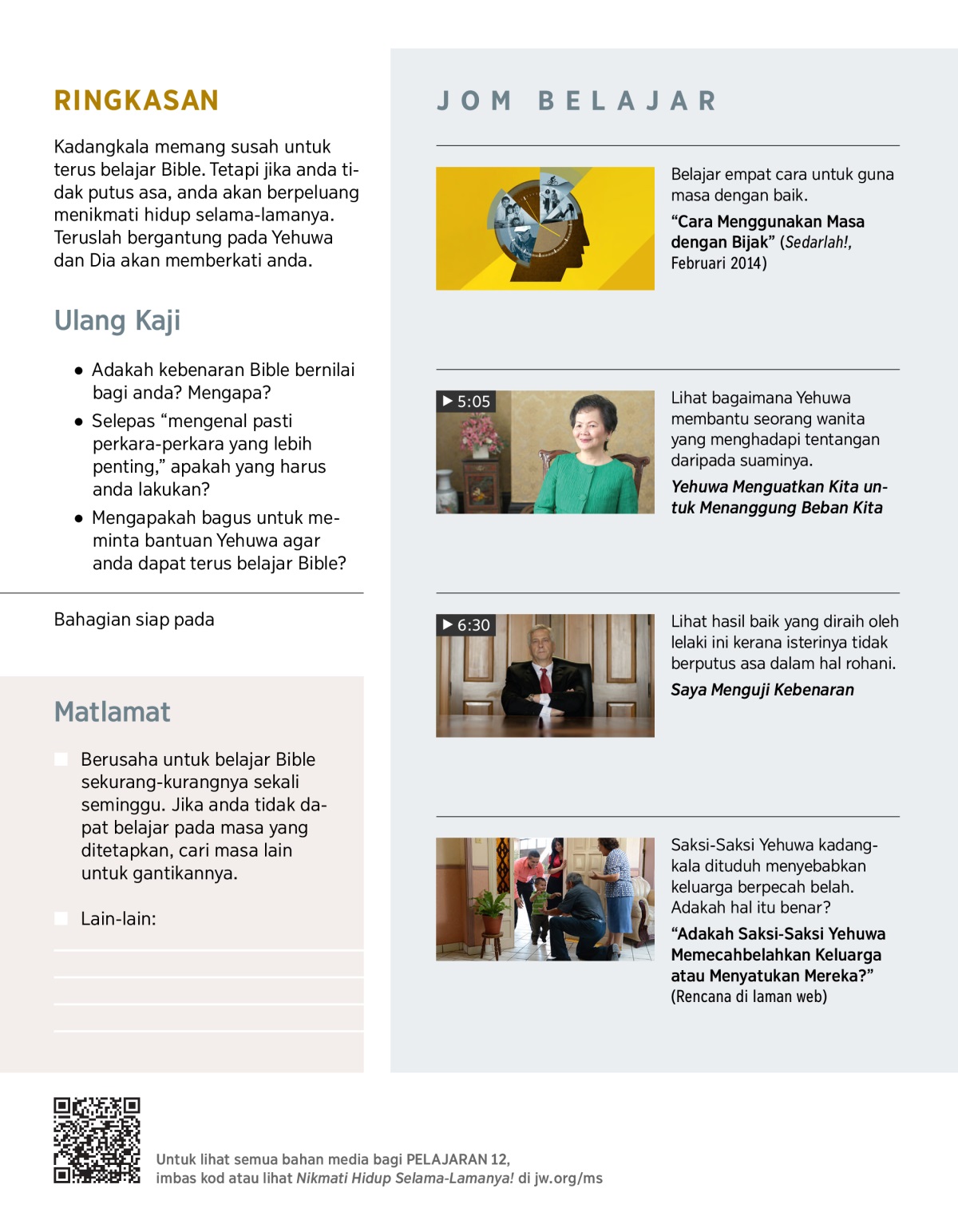 Lihatlah bagaimana anda dapat terus belajar Bible walaupun anda sibuk atau menghadapi tentangan. Kemudian, belajar bagaimana Yehuwa membantu anda untuk tidak putus asa.