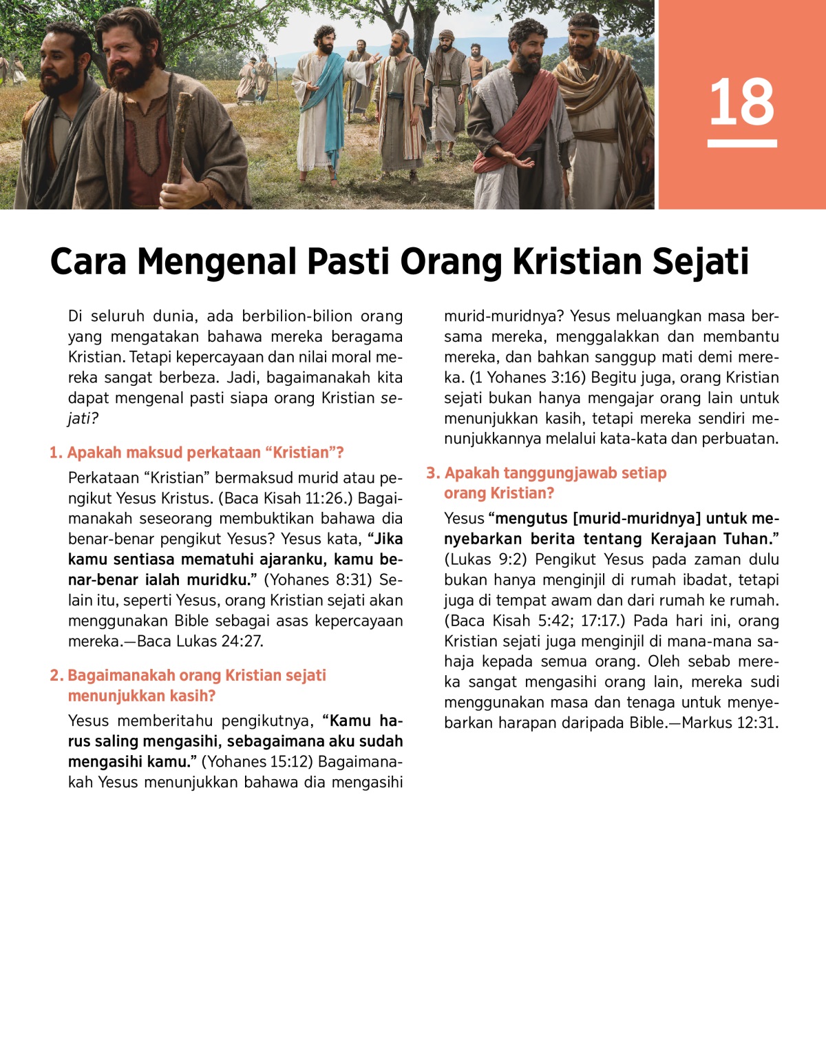 Yesus memberitahu pengikutnya, “Kamu harus saling mengasihi, sebagaimana aku sudah mengasihi kamu.” (Yohanes 15:12) Bagaimanakah Yesus menunjukkan bahawa dia mengasihi murid-muridnya? Yesus meluangkan masa bersama mereka, menggalakkan dan membantu mereka, dan bahkan sanggup mati demi mereka. (1 Yohanes 3:16) Begitu juga, orang Kristian sejati bukan hanya mengajar orang lain untuk menunjukkan kasih, tetapi mereka sendiri menunjukkannya melalui kata-kata dan perbuatan.