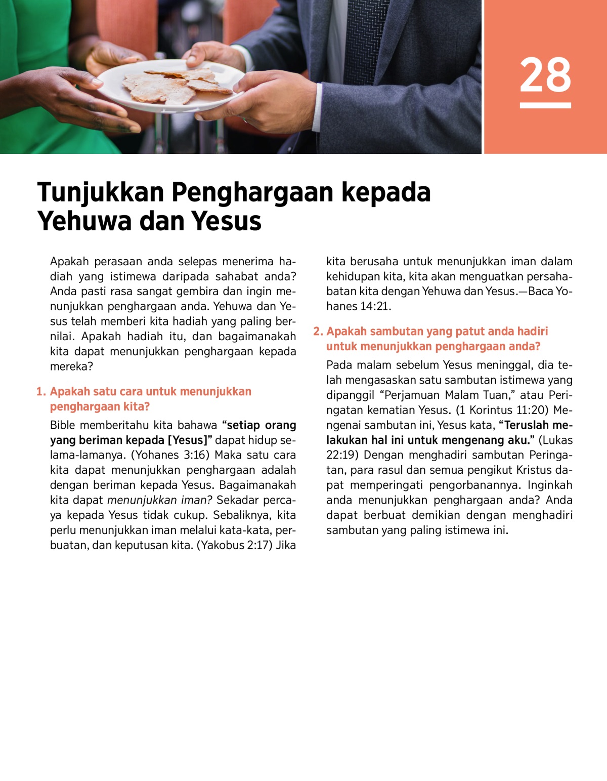 Pada malam sebelum Yesus meninggal, dia telah mengasaskan satu sambutan istimewa yang dipanggil “Perjamuan Malam Tuan,” atau Peringatan kematian Yesus. (1 Korintus 11:20) Mengenai sambutan ini, Yesus kata, “Teruslah melakukan hal ini untuk mengenang aku.” (Lukas 22:19) Dengan menghadiri sambutan Peringatan, para rasul dan semua pengikut Kristus dapat memperingati pengorbanannya. Inginkah anda menunjukkan penghargaan anda? Anda dapat berbuat demikian dengan menghadiri sambutan yang paling istimewa ini.
