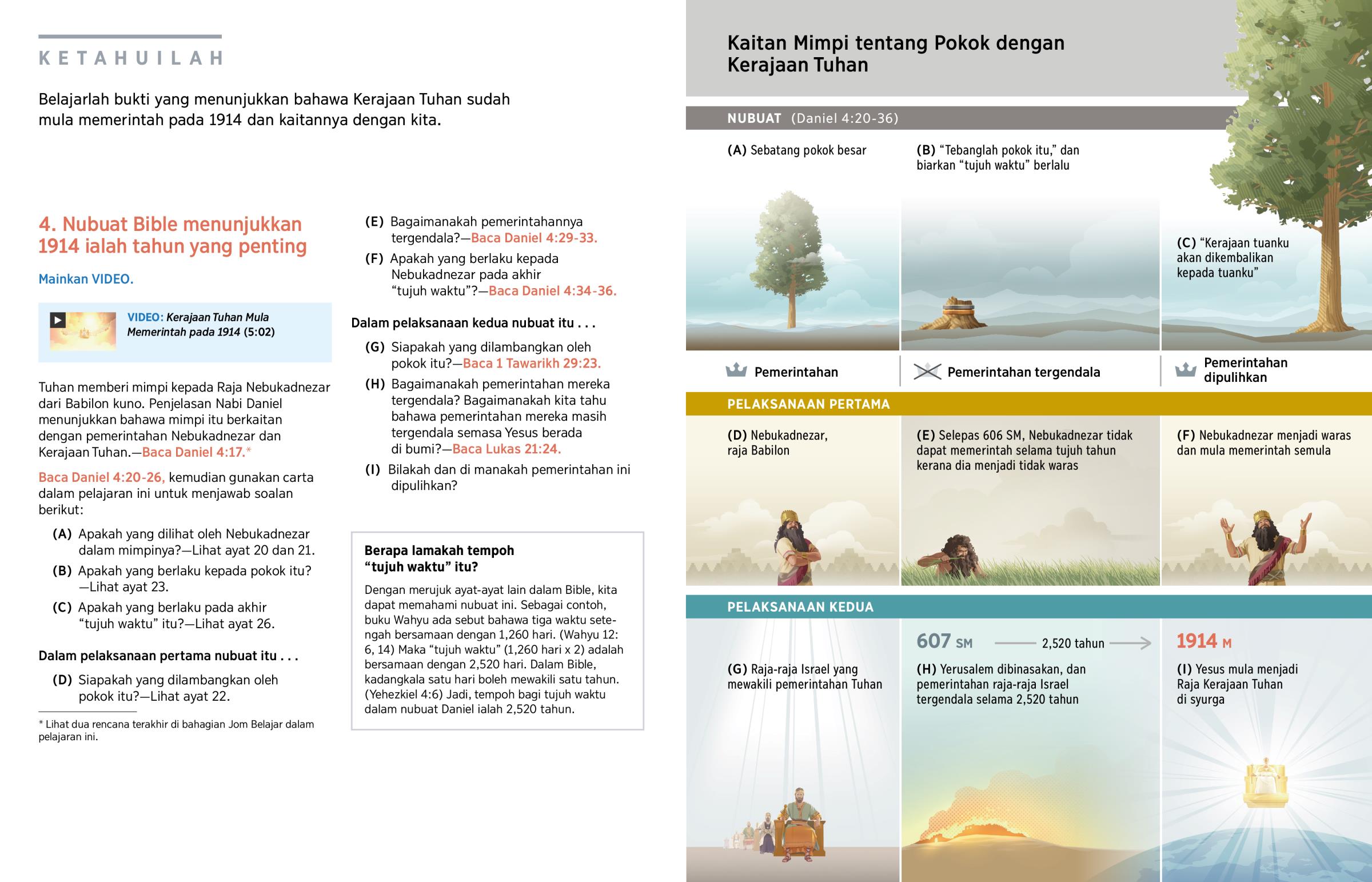 Buku Daniel menunjukkan bahawa Kerajaan Tuhan akan mula memerintah pada akhir tempoh yang dipanggil “tujuh waktu.” (Daniel 4:16, 17) Beberapa ratus tahun kemudian, Yesus memanggil tempoh itu sebagai “waktu yang ditetapkan bagi bangsa-bangsa lain.” Semasa dia masih di bumi, dia mengajar bahawa tempoh waktu itu belum berakhir. (Lukas 21:24) Seperti yang akan kita kaji nanti, tujuh waktu itu berakhir pada 1914.
