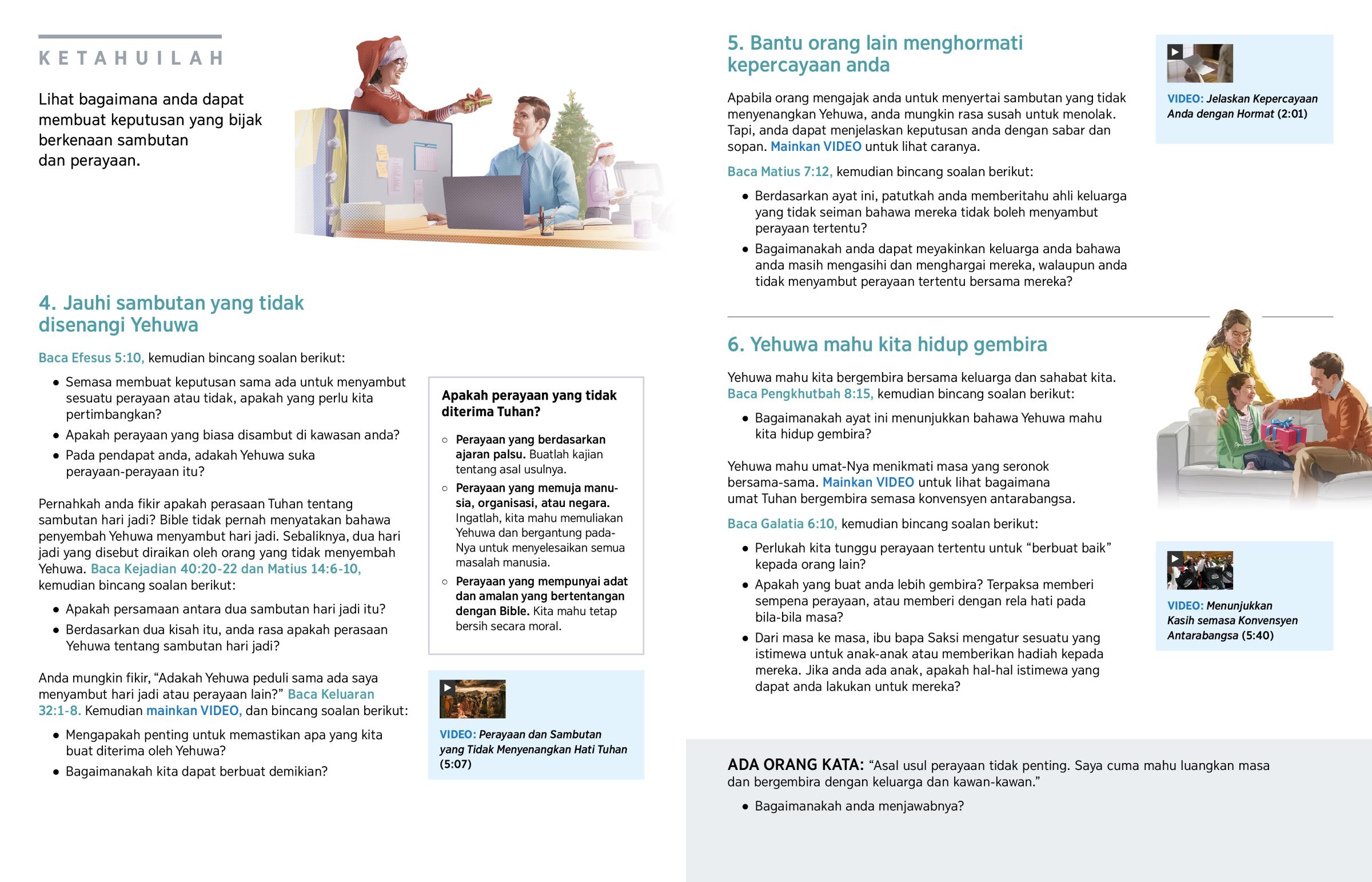 Apabila orang mengajak anda untuk menyertai sambutan yang tidak menyenangkan Yehuwa, anda mungkin rasa susah untuk menolak. Tapi, anda dapat menjelaskan keputusan anda dengan sabar dan sopan. Mainkan VIDEO untuk lihat caranya.