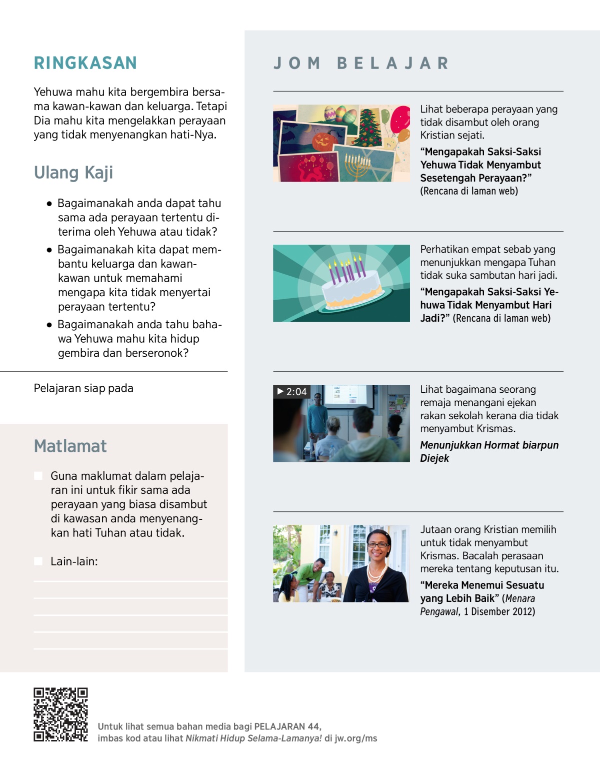 Anda mungkin fikir, “Adakah Yehuwa peduli sama ada saya menyambut hari jadi atau perayaan lain?” Baca Keluaran 32:1-8. Kemudian mainkan VIDEO, dan bincang soalan berikut: