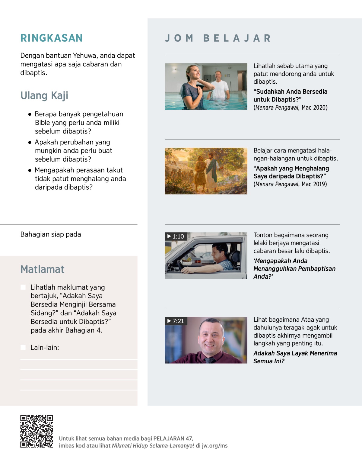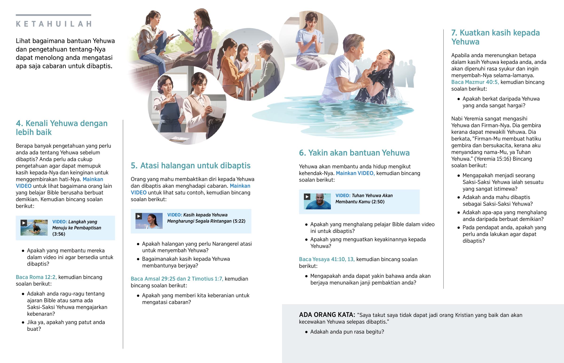 Lihat bagaimana bantuan Yehuwa dan pengetahuan tentang-Nya dapat menolong anda mengatasi apa saja cabaran untuk dibaptis.