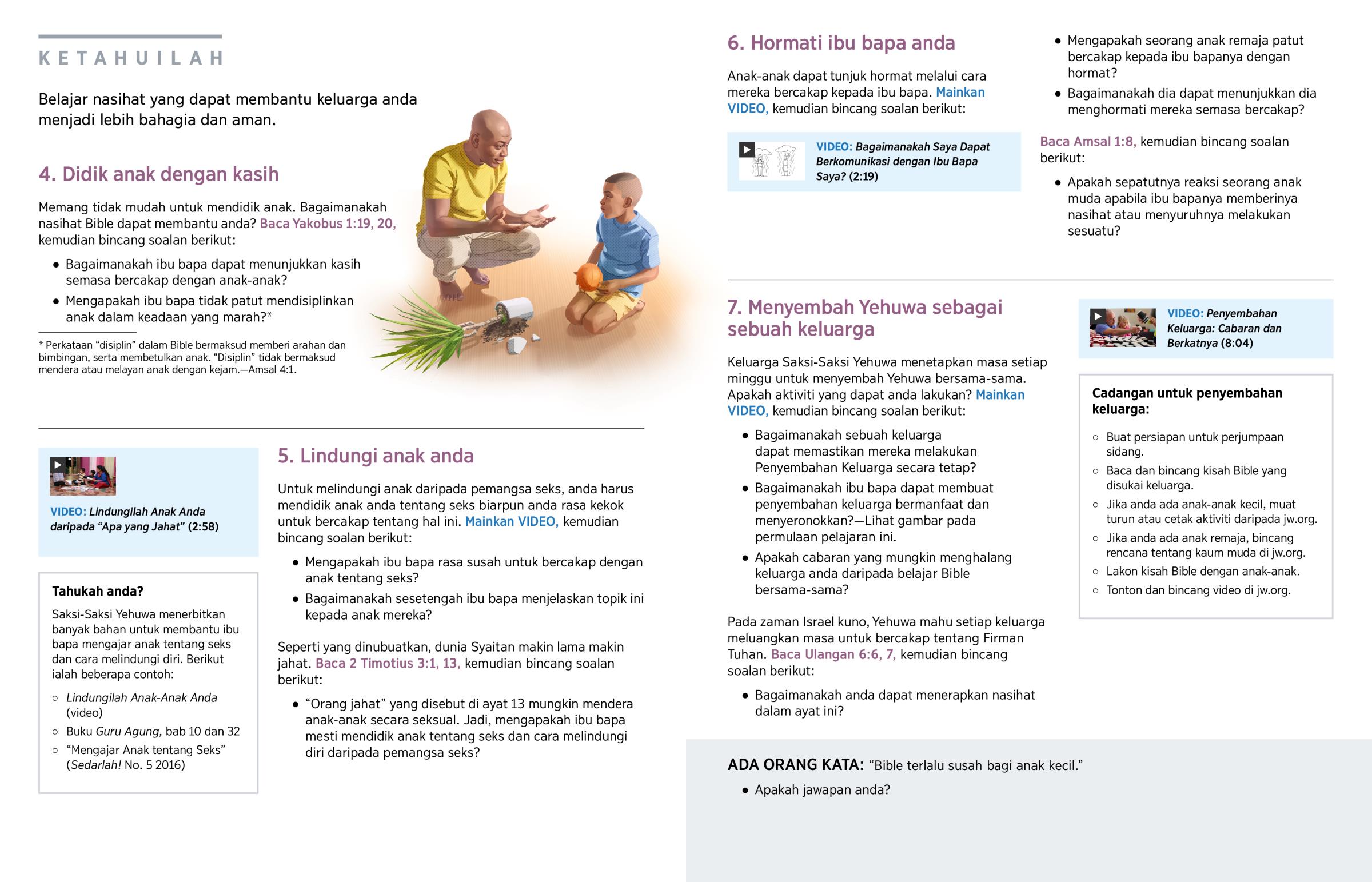 Saksi-Saksi Yehuwa menerbitkan banyak bahan untuk membantu ibu bapa mengajar anak tentang seks dan cara melindungi diri. Berikut ialah beberapa contoh: