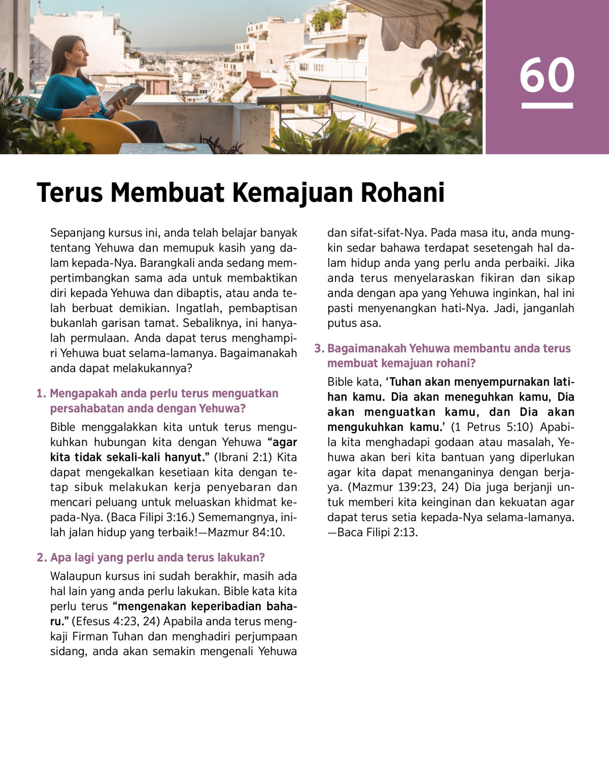 Walaupun kursus ini sudah berakhir, masih ada hal lain yang anda perlu lakukan. Bible kata kita perlu terus “mengenakan keperibadian baharu.” (Efesus 4:23, 24) Apabila anda terus mengkaji Firman Tuhan dan menghadiri perjumpaan sidang, anda akan semakin mengenali Yehuwa dan sifat-sifat-Nya. Pada masa itu, anda mungkin sedar bahawa terdapat sesetengah hal dalam hidup anda yang perlu anda perbaiki. Jika anda terus menyelaraskan fikiran dan sikap anda dengan apa yang Yehuwa inginkan, hal ini pasti menyenangkan hati-Nya. Jadi, janganlah putus asa.