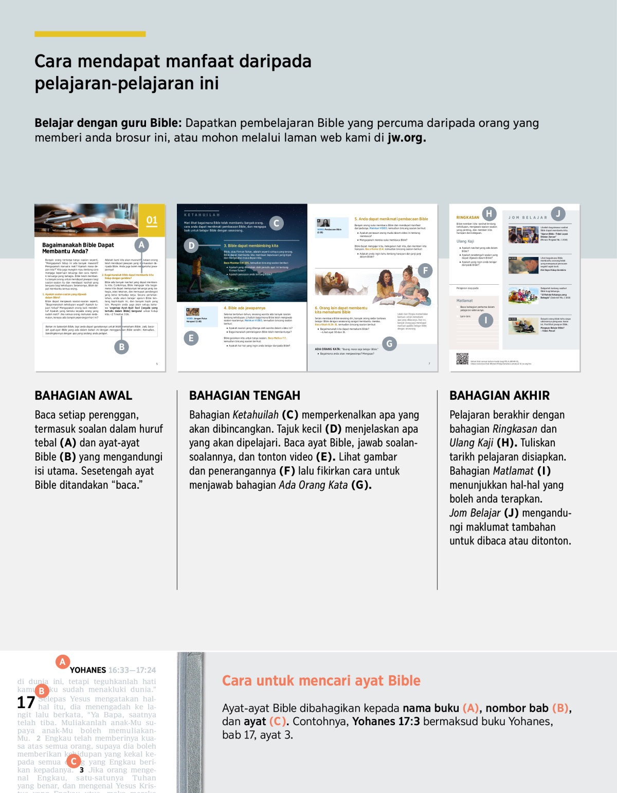 Bahagian Ketahuilah (C) memperkenalkan apa yang akan dibincangkan. Tajuk kecil (D) menjelaskan apa yang akan dipelajari. Baca ayat Bible, jawab soalan-soalannya, dan tonton video (E).