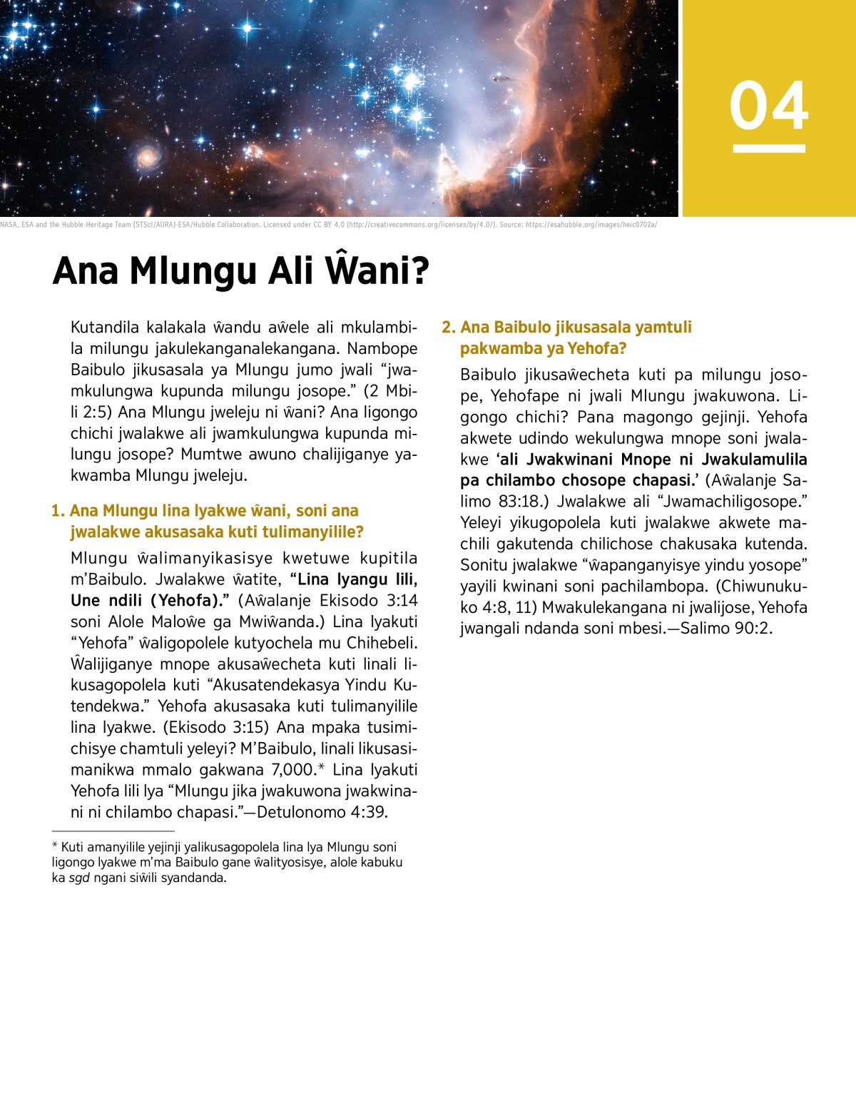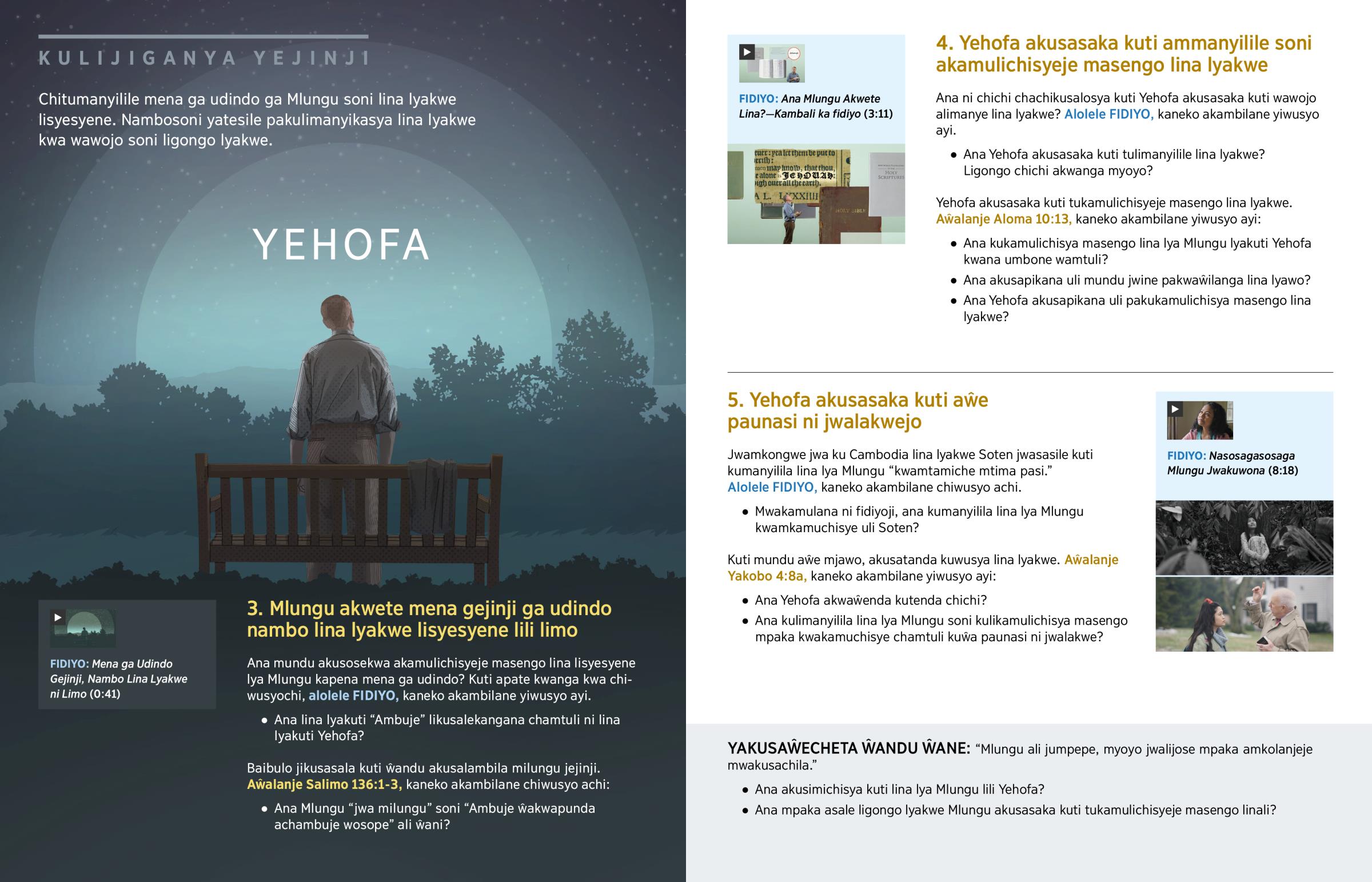 Mlungu ŵalimanyikasisye kwetuwe kupitila m’Baibulo. Jwalakwe ŵatite, “Lina lyangu lili, Une ndili (Yehofa).” (Aŵalanje Ekisodo 3:14 soni Alole Maloŵe ga Mwiŵanda.) Lina lyakuti “Yehofa” ŵaligopolele kutyochela mu Chihebeli. Ŵalijiganye mnope akusaŵecheta kuti linali likusagopolela kuti “Akusatendekasya Yindu Kutendekwa.” Yehofa akusasaka kuti tulimanyilile lina lyakwe. (Ekisodo 3:15) Ana mpaka tusimichisye chamtuli yeleyi? M’Baibulo, linali likusasimanikwa mmalo gakwana 7,000.a Lina lyakuti Yehofa lili lya “Mlungu jika jwakuwona jwakwinani ni chilambo chapasi.”—Detulonomo 4:39.