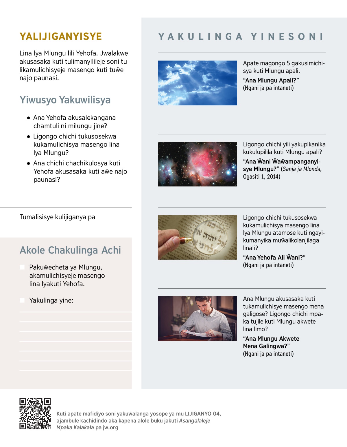 Lina lya Mlungu lili Yehofa. Jwalakwe akusasaka kuti tulimanyilileje soni tulikamulichisyeje masengo kuti tuŵe najo paunasi.