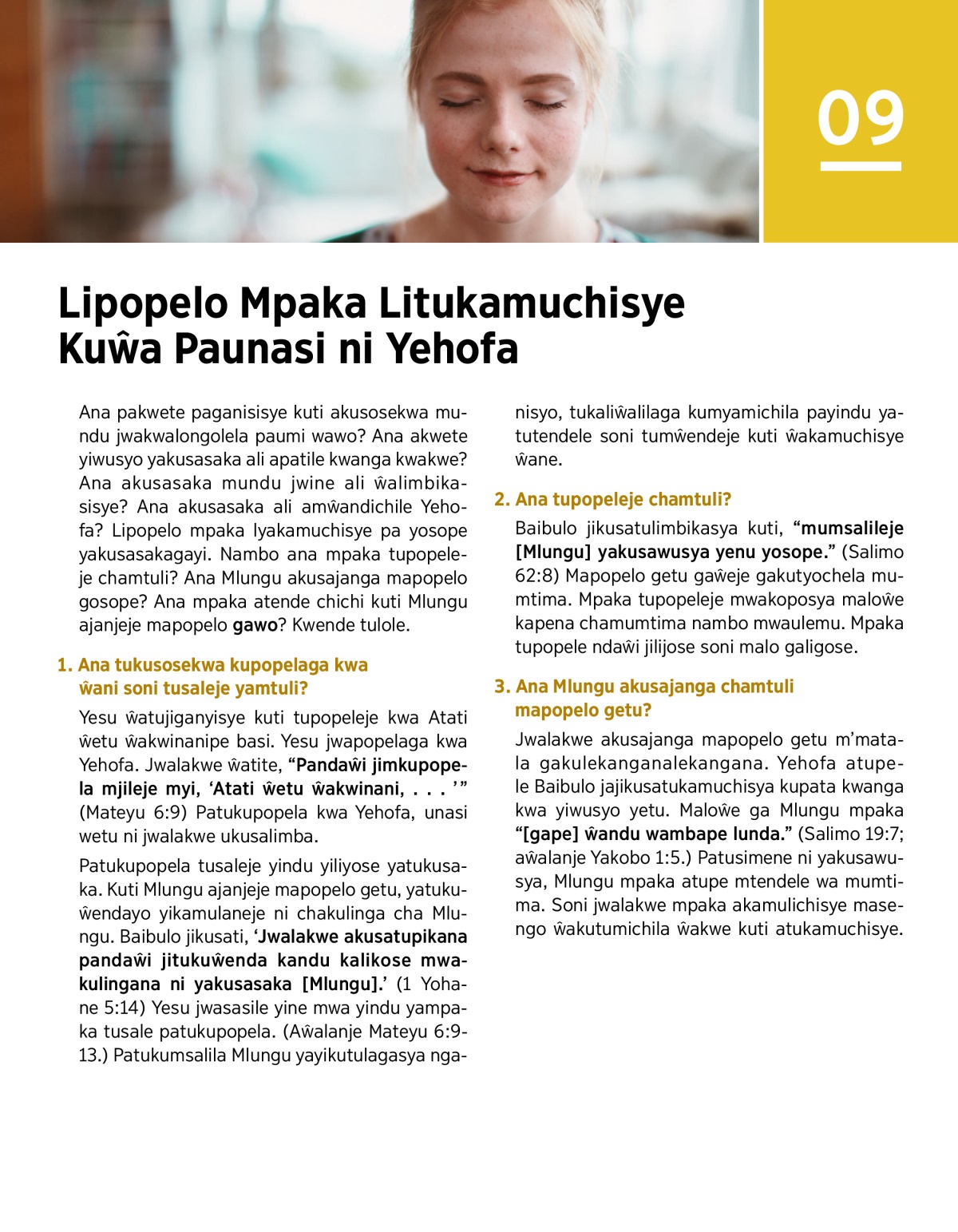 Jwalakwe akusajanga mapopelo getu m’matala gakulekanganalekangana. Yehofa atupele Baibulo jajikusatukamuchisya kupata kwanga kwa yiwusyo yetu. Maloŵe ga Mlungu mpaka “[gape] ŵandu wambape lunda.” (Salimo 19:7; aŵalanje Yakobo 1:5.) Patusimene ni yakusawusya, Mlungu mpaka atupe mtendele wa mumtima. Soni jwalakwe mpaka akamulichisye masengo ŵakutumichila ŵakwe kuti atukamuchisye.