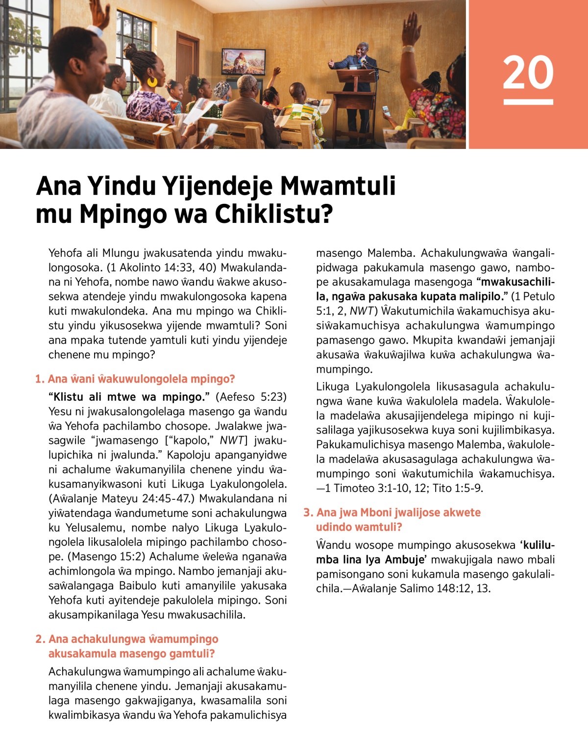 Yehofa ali Mlungu jwakusatenda yindu mwakulongosoka. (1 Akolinto 14:33, 40) Mwakulandana ni Yehofa, nombe nawo ŵandu ŵakwe akusosekwa atendeje yindu mwakulongosoka kapena kuti mwakulondeka. Ana mu mpingo wa Chiklistu yindu yikusosekwa yijende mwamtuli? Soni ana mpaka tutende yamtuli kuti yindu yijendeje chenene mu mpingo?