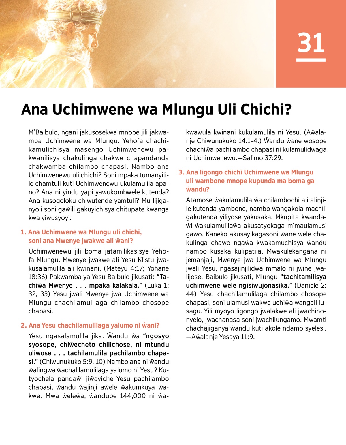 M’Baibulo, ngani jakusosekwa mnope jili jakwamba Uchimwene wa Mlungu. Yehofa chachikamulichisya masengo Uchimwenewu pakwanilisya chakulinga chakwe chapandanda chakwamba chilambo chapasi. Nambo ana Uchimwenewu uli chichi? Soni mpaka tumanyilile chamtuli kuti Uchimwenewu ukulamulila apano? Ana ni yindu yapi yawukombwele kutenda? Ana kusogoloku chiwutende yamtuli? Mu lijiganyoli soni gaŵili gakuyichisya chitupate kwanga kwa yiwusyoyi.