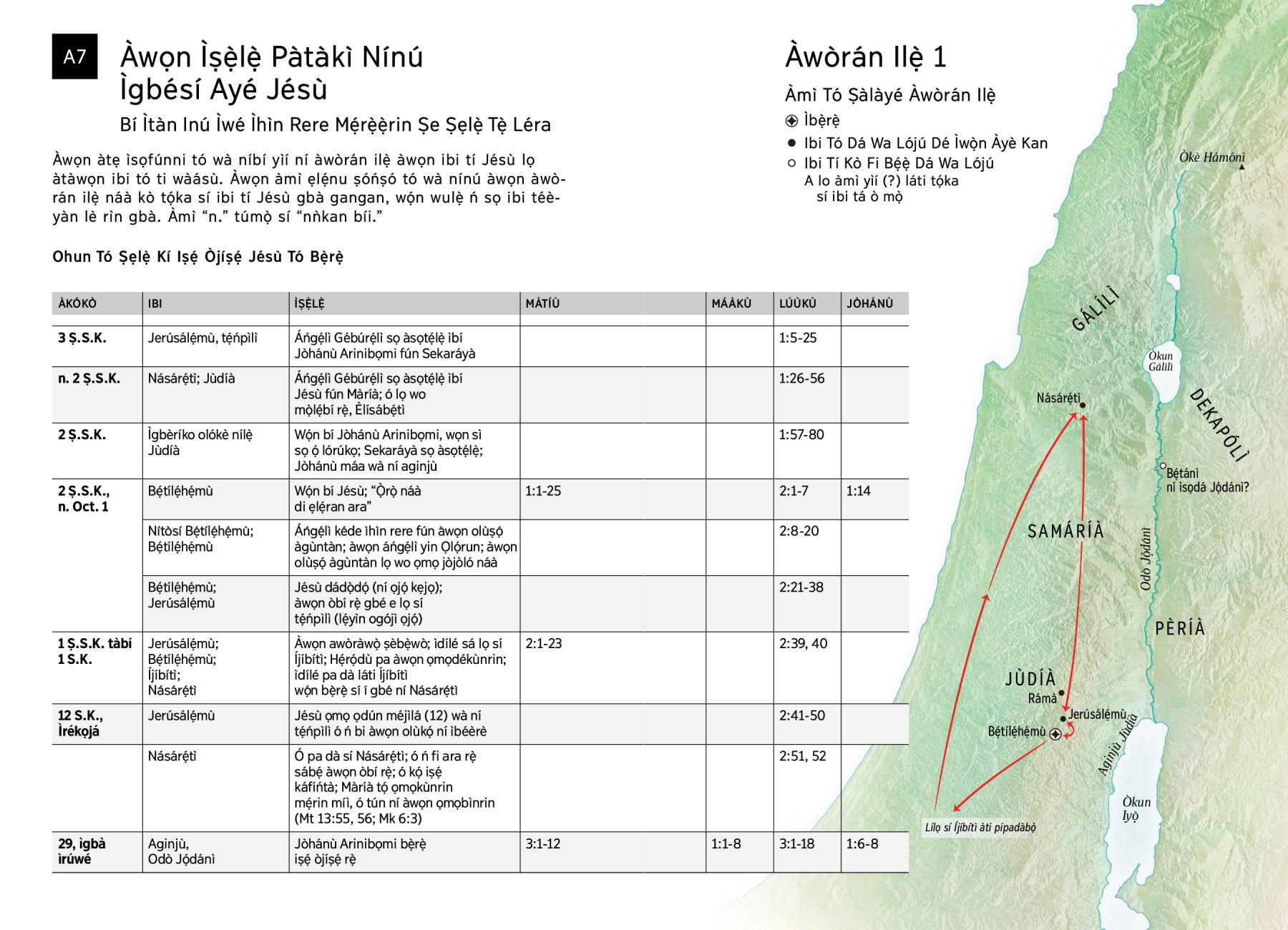 Àwọn àtẹ ìsọfúnni tó wà níbí yìí ní àwòrán ilẹ̀ àwọn ibi tí Jésù lọ àtàwọn ibi tó ti wàásù. Àwọn àmì ẹlẹ́nu ṣóńṣó tó wà nínú àwọn àwòrán ilẹ̀ náà kò tọ́ka sí ibi tí Jésù gbà gangan, wọ́n wulẹ̀ ń sọ ibi téèyàn lè rìn gbà. Àmì “n.” túmọ̀ sí “nǹkan bíi.”