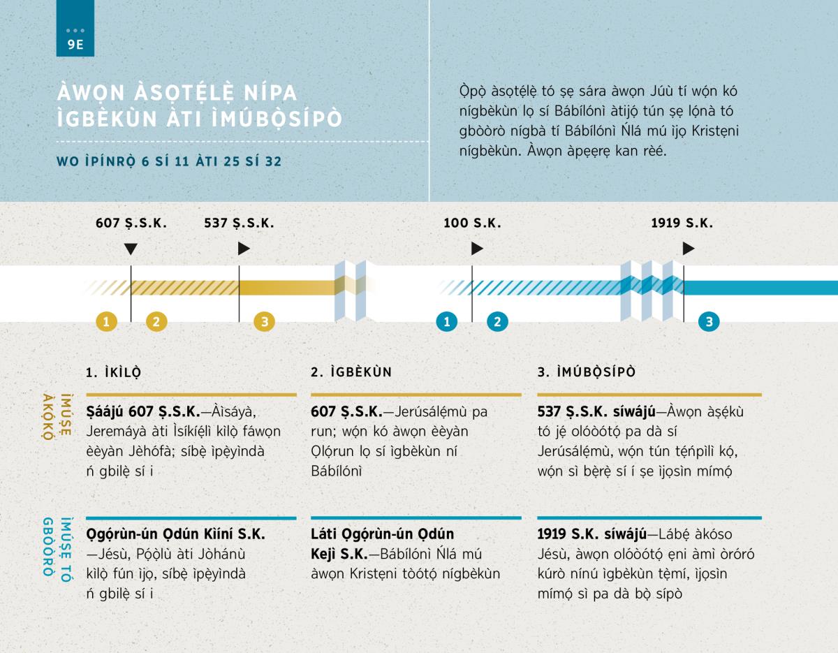 537 Ṣ.S.K. síwájú—Àwọn àṣẹ́kù tó jẹ́ olóòótọ́ pa dà sí Jerúsálẹ́mù, wọ́n tún tẹ́ńpìlì kọ́, wọ́n sì bẹ̀rẹ̀ sí í ṣe ìjọsìn mímọ́ |