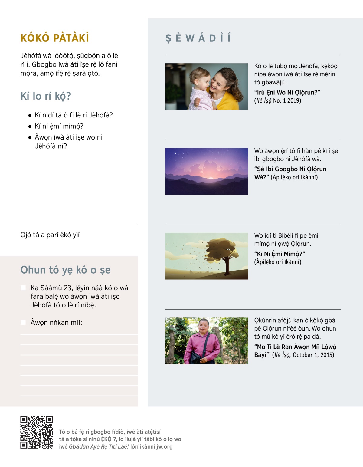 Irú ẹni wo lo rò pé Jèhófà jẹ́? Ṣó o gbà pé Ọlọ́run tóbi lọ́ba, àmọ́ ó jìnnà sí wa gan-an bí ìràwọ̀ tó wà lójú ọ̀run? Àbí ńṣe lo rò pé ó jẹ́ alágbára ńlá kan, àmọ́ tó dà bí ìjì àti ààrá tí kò ṣeé tù lójú? Irú ẹni wo ni Jèhófà jẹ́ gangan? Bíbélì Ọ̀rọ̀ Ọlọ́run jẹ́ ká mọ àwọn ìwà àti ìṣe Jèhófà, ó sì tún jẹ́ ká mọ̀ pé ó nífẹ̀ẹ́ wa lẹ́nì kọ̀ọ̀kan.