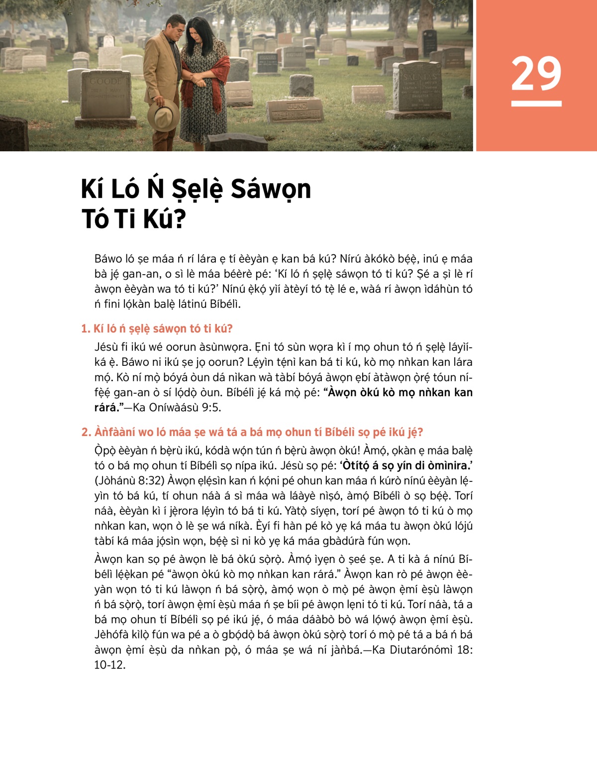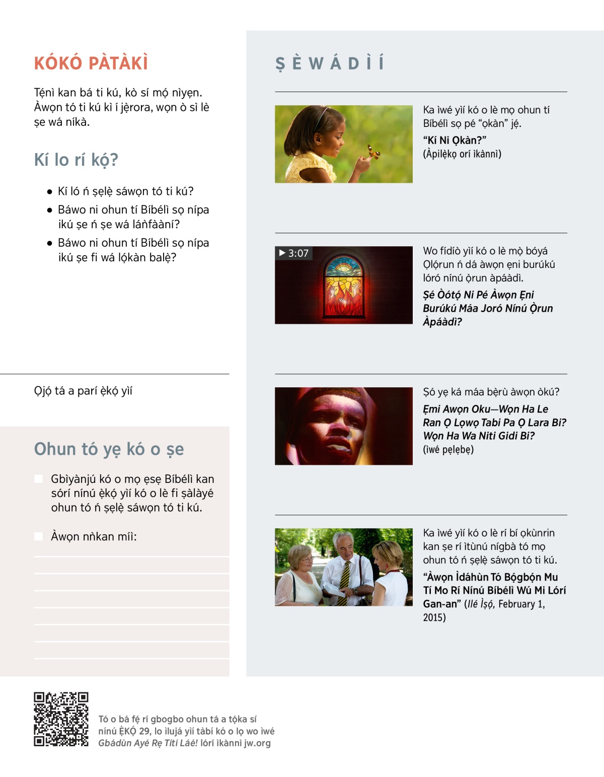 Báwo ló ṣe máa ń rí lára ẹ tí èèyàn ẹ kan bá kú? Nírú àkókò bẹ́ẹ̀, inú ẹ máa bà jẹ́ gan-an, o sì lè máa béèrè pé: ‘Kí ló ń ṣẹlẹ̀ sáwọn tó ti kú? Ṣé a ṣì lè rí àwọn èèyàn wa tó ti kú?’ Nínú ẹ̀kọ́ yìí àtèyí tó tẹ̀ lé e, wàá rí àwọn ìdáhùn tó ń fini lọ́kàn balẹ̀ látinú Bíbélì.