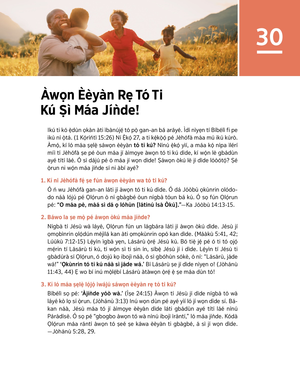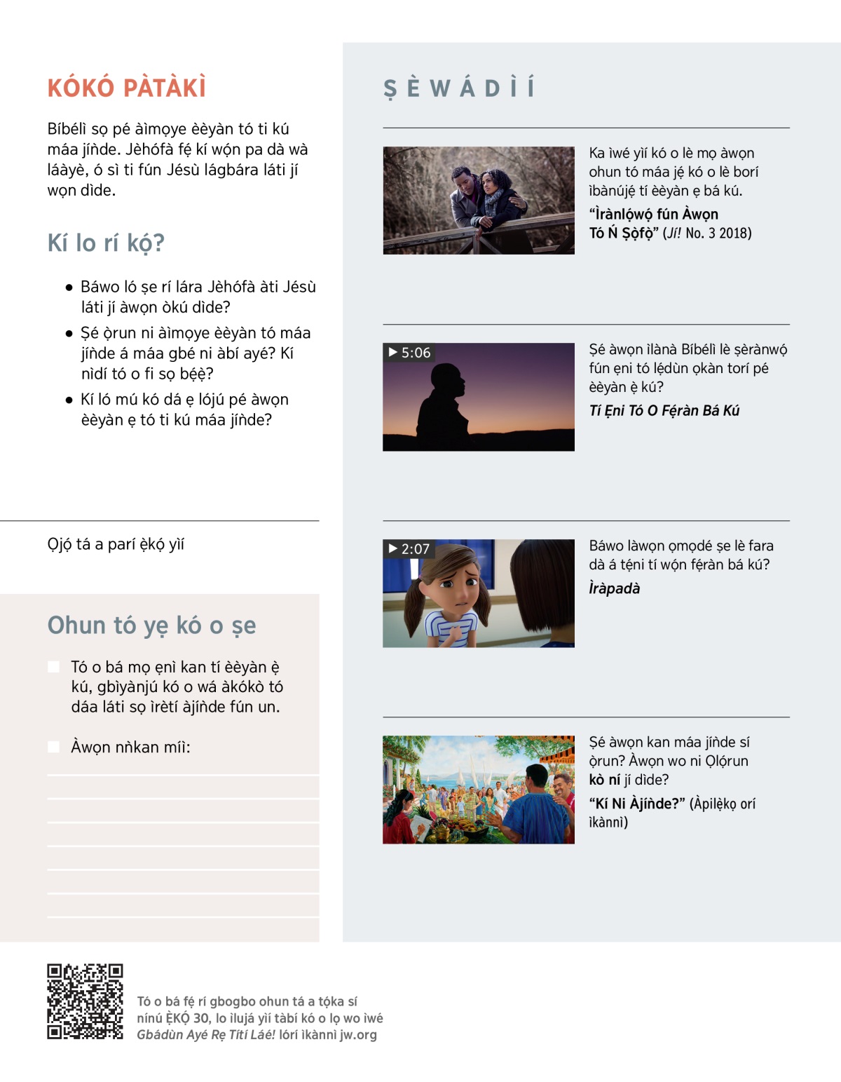 Ikú ti kó ẹ̀dùn ọkàn àti ìbànújẹ́ tó pọ̀ gan-an bá aráyé. Ìdí nìyẹn tí Bíbélì fi pe ikú ní ọ̀tá. (1 Kọ́ríńtì 15:26) Ní Ẹ̀kọ́ 27, a ti kẹ́kọ̀ọ́ pé Jèhófà máa mú ikú kúrò. Àmọ́, kí ló máa ṣẹlẹ̀ sáwọn èèyàn tó ti kú? Nínú ẹ̀kọ́ yìí, a máa kọ́ nípa ìlérí míì tí Jèhófà ṣe pé òun máa jí àìmọye àwọn tó ti kú dìde, kí wọ́n lè gbádùn ayé títí láé. Ó sì dájú pé ó máa jí wọn dìde! Ṣáwọn òkú lè jí dìde lóòótọ́? Ṣé ọ̀run ni wọ́n máa jíǹde sí ni àbí ayé?