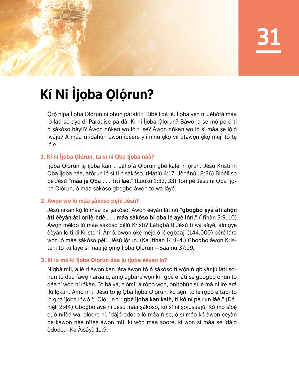Ọ̀rọ̀ nípa Ìjọba Ọlọ́run ni ohun pàtàkì tí Bíbélì dá lé. Ìjọba yẹn ni Jèhófà máa lò láti sọ ayé di Párádísè pa dà. Kí ni Ìjọba Ọlọ́run? Báwo la ṣe mọ̀ pé ó ti ń ṣàkóso báyìí? Àwọn nǹkan wo ló ti ṣe? Àwọn nǹkan wo ló sì máa ṣe lọ́jọ́ iwájú? A máa rí ìdáhùn àwọn ìbéèrè yìí nínú ẹ̀kọ́ yìí àtàwọn ẹ̀kọ́ méjì tó tẹ̀ lé e.