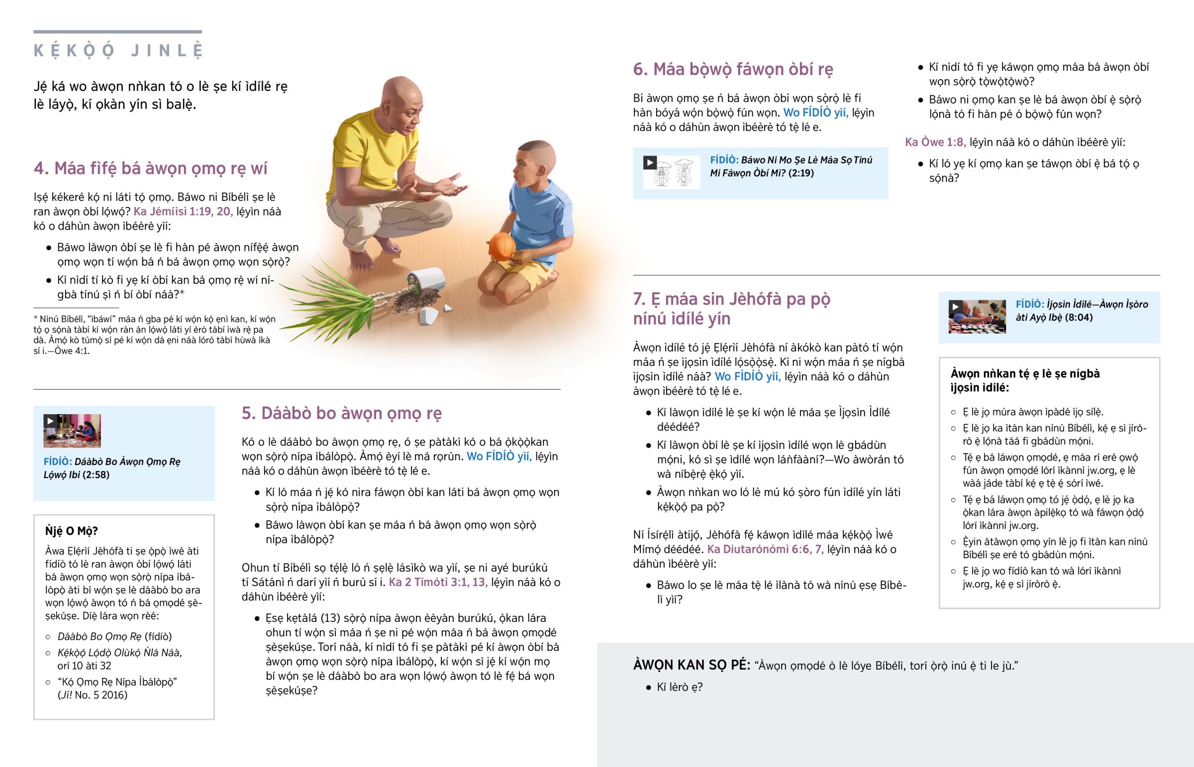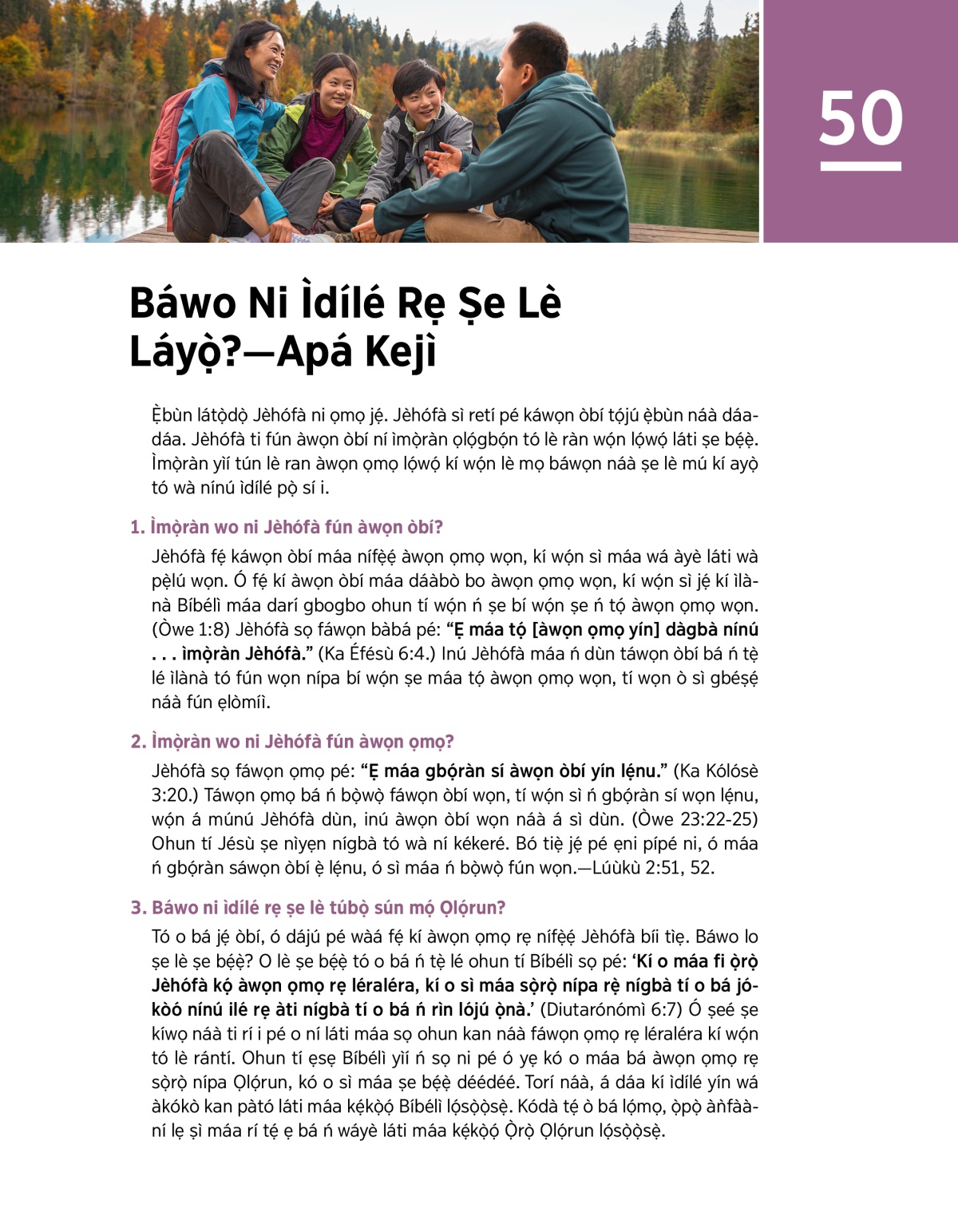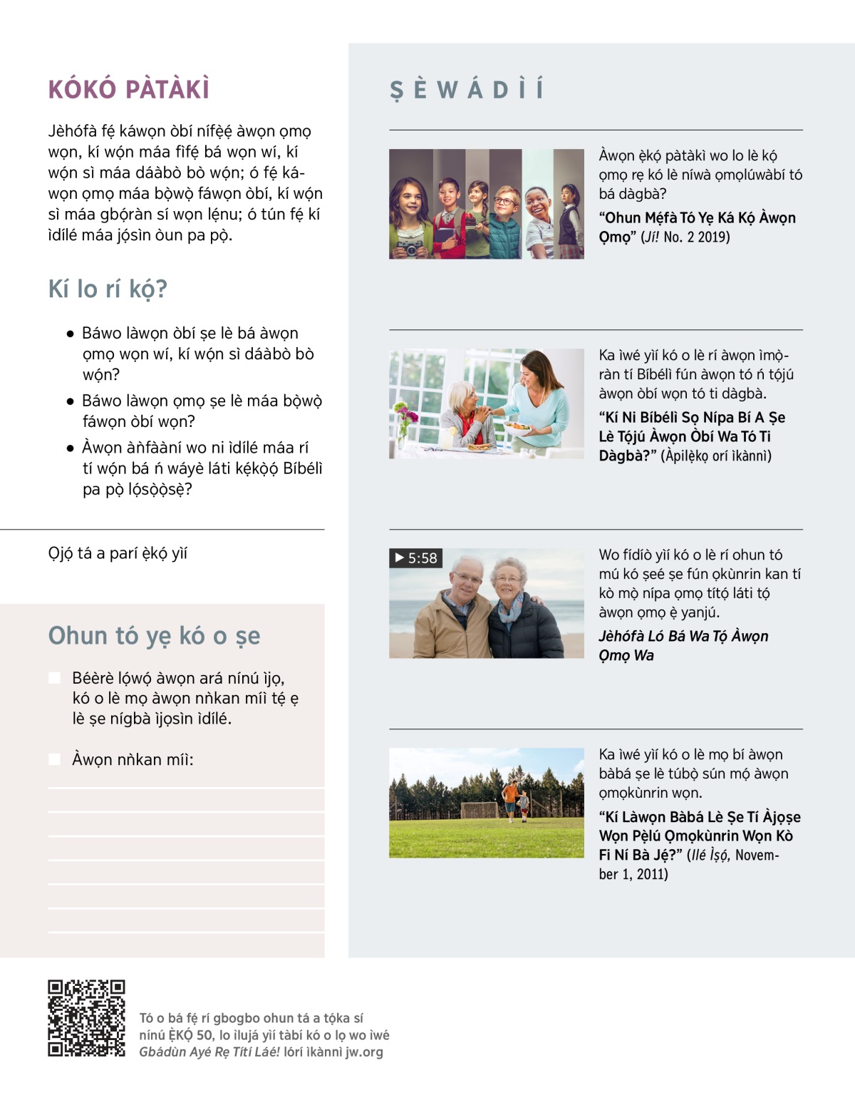 Tẹ́ ẹ bá láwọn ọmọ tó jẹ́ ọ̀dọ́, ẹ lè jọ ka ọ̀kan lára àwọn àpilẹ̀kọ tó wà fáwọn ọ̀dọ́ lórí ìkànnì jw.org.