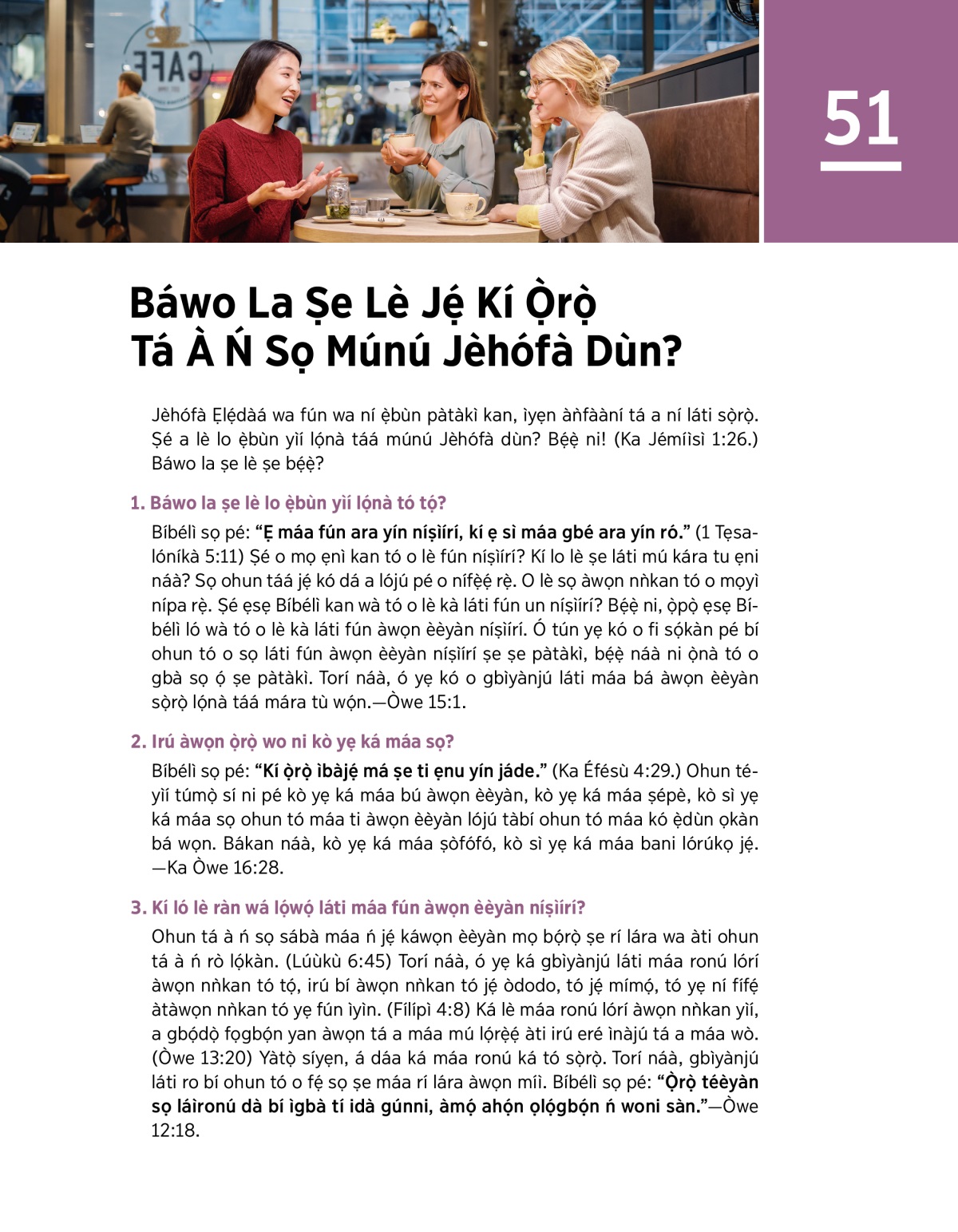 Jẹ́ ká kọ́ bá a ṣe lè máa sọ̀rọ̀ lọ́nà tó máa múnú Jèhófà dùn àti bá a ṣe lè máa fún àwọn míì níṣìírí.