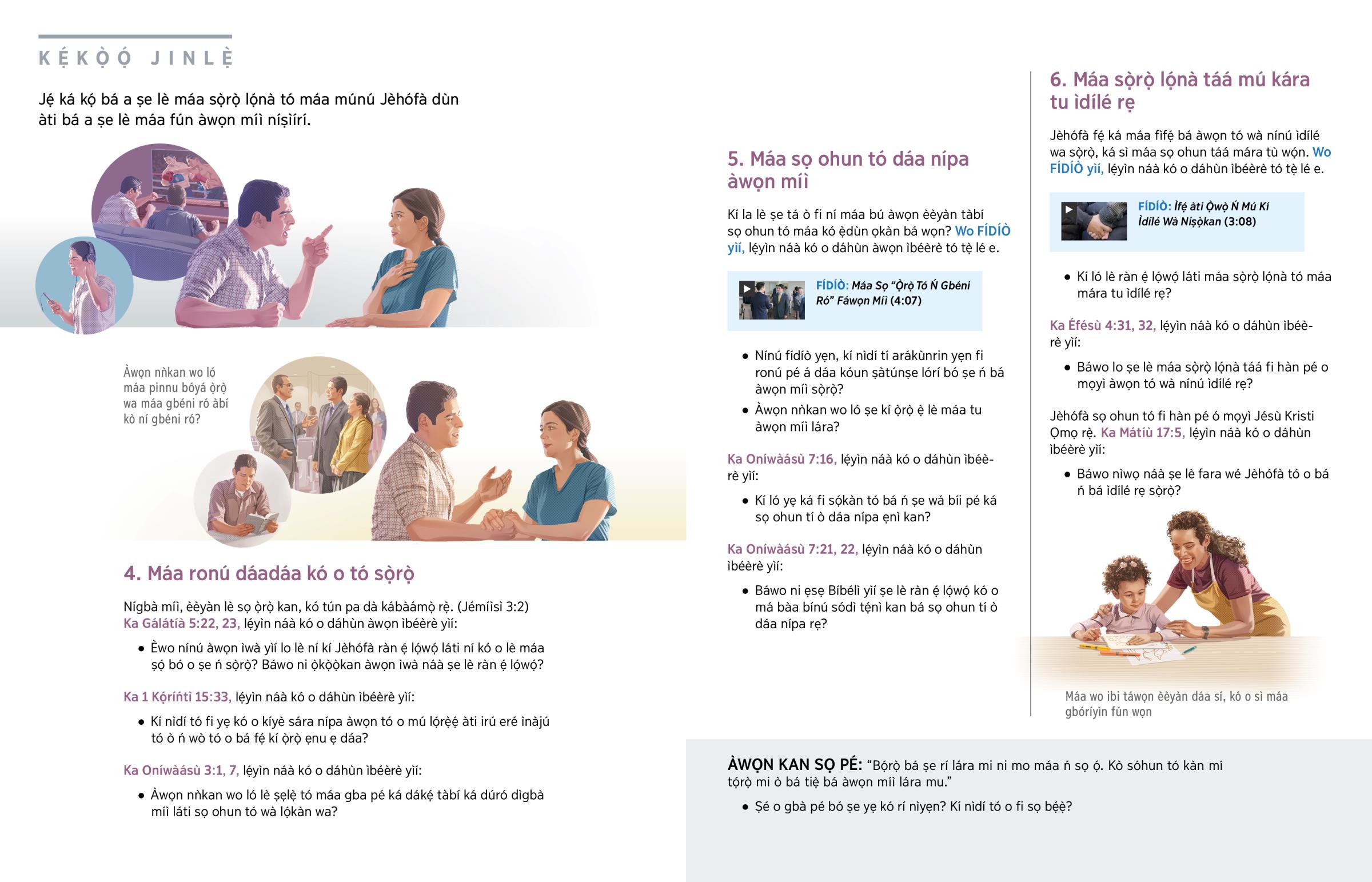Nígbà míì, èèyàn lè sọ ọ̀rọ̀ kan, kó tún pa dà kábàámọ̀ rẹ̀. (Jémíìsì 3:2) Ka Gálátíà 5:22, 23, lẹ́yìn náà kó o dáhùn àwọn ìbéèrè yìí: