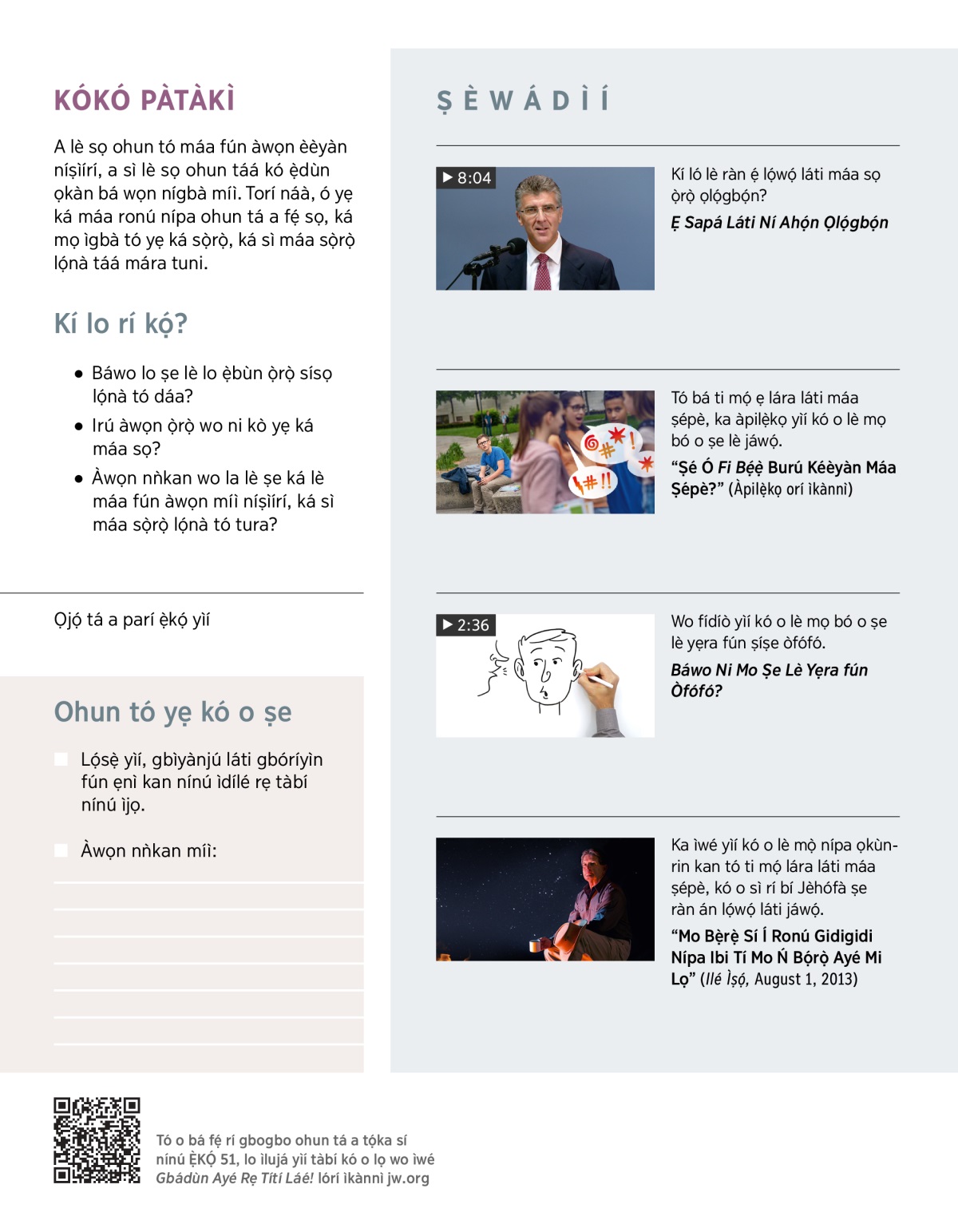 A lè sọ ohun tó máa fún àwọn èèyàn níṣìírí, a sì lè sọ ohun táá kó ẹ̀dùn ọkàn bá wọn nígbà míì. Torí náà, ó yẹ ká máa ronú nípa ohun tá a fẹ́ sọ, ká mọ ìgbà tó yẹ ká sọ̀rọ̀, ká sì máa sọ̀rọ̀ lọ́nà táá mára tuni.