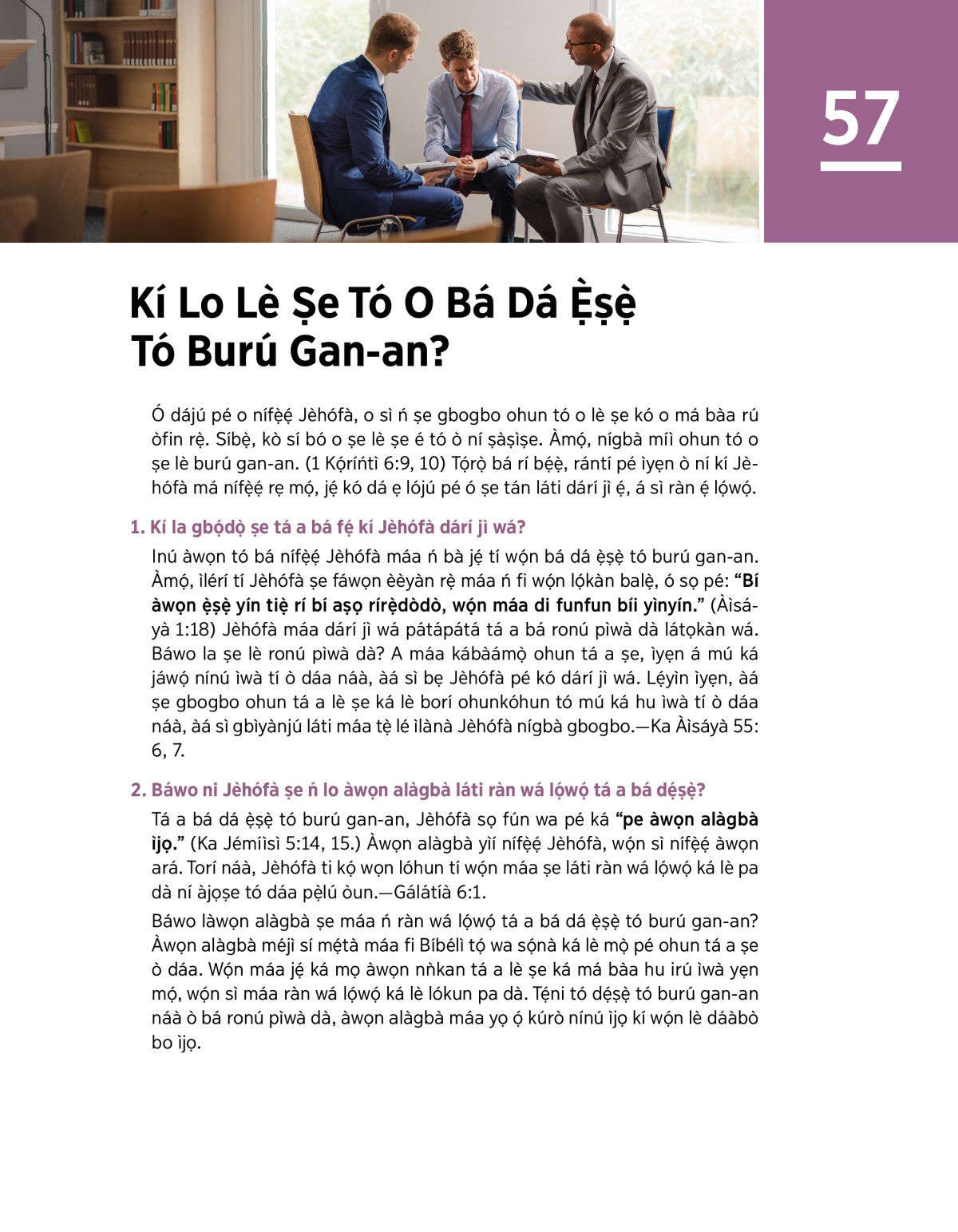 Báwo làwọn alàgbà ṣe máa ń ràn wá lọ́wọ́ tá a bá dá ẹ̀ṣẹ̀ tó burú gan-an? Àwọn alàgbà méjì sí mẹ́tà máa fi Bíbélì tọ́ wa sọ́nà ká lè mọ̀ pé ohun tá a ṣe ò dáa. Wọ́n máa jẹ́ ká mọ àwọn nǹkan tá a lè ṣe ká má bàa hu irú ìwà yẹn mọ́, wọ́n sì máa ràn wá lọ́wọ́ ká lè lókun pa dà. Tẹ́ni tó dẹ́ṣẹ̀ tó burú gan-an náà ò bá ronú pìwà dà, àwọn alàgbà máa yọ ọ́ kúrò nínú ìjọ kí wọ́n lè dáàbò bo ìjọ.