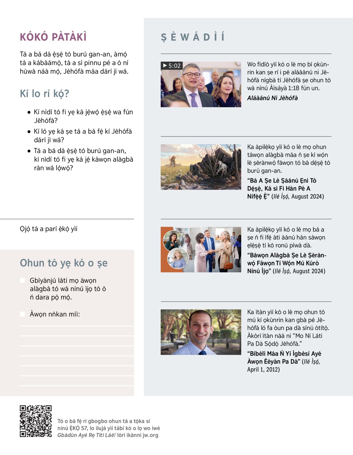 Ka ìtàn yìí kó o lè mọ ohun tó mú kí ọkùnrin kan gbà pé Jèhófà ló fa òun pa dà sínú òtítọ́. Àkòrí ìtàn náà ni “Mo Ní Láti Pa Dà Sọ́dọ̀ Jèhófà.”