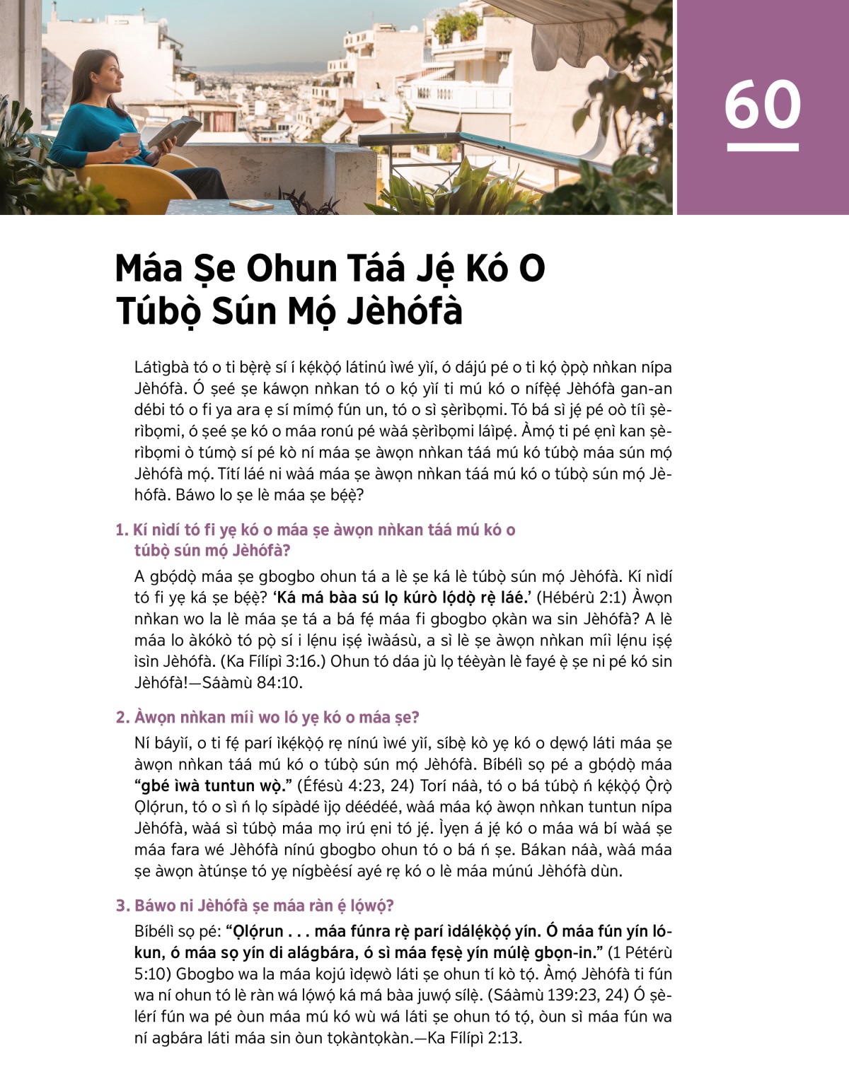 Látìgbà tó o ti bẹ̀rẹ̀ sí í kẹ́kọ̀ọ́ látinú ìwé yìí, ó dájú pé o ti kọ́ ọ̀pọ̀ nǹkan nípa Jèhófà. Ó ṣeé ṣe káwọn nǹkan tó o kọ́ yìí ti mú kó o nífẹ̀ẹ́ Jèhófà gan-an débi tó o fi ya ara ẹ sí mímọ́ fún un, tó o sì ṣèrìbọmi. Tó bá sì jẹ́ pé oò tíì ṣèrìbọmi, ó ṣeé ṣe kó o máa ronú pé wàá ṣèrìbọmi láìpẹ́. Àmọ́ ti pé ẹnì kan ṣèrìbọmi ò túmọ̀ sí pé kò ní máa ṣe àwọn nǹkan táá mú kó túbọ̀ máa sún mọ́ Jèhófà mọ́. Títí láé ni wàá máa ṣe àwọn nǹkan táá mú kó o túbọ̀ sún mọ́ Jèhófà. Báwo lo ṣe lè máa ṣe bẹ́ẹ̀?