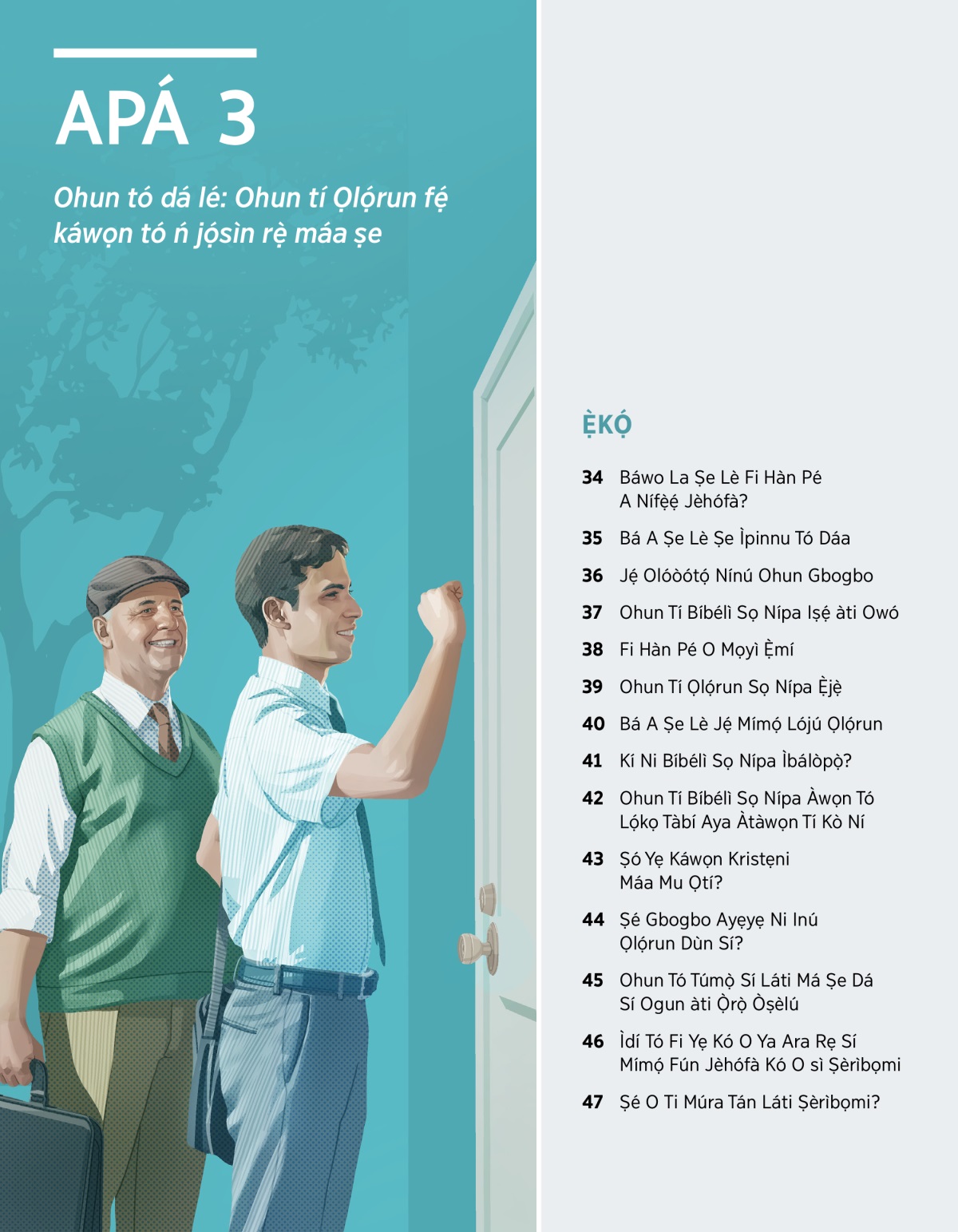 APÁ 3 Bíi Ti Orí Ìwé Ohun tó dá lé: Ohun tí Ọlọ́run fẹ́ káwọn tó ń jọ́sìn rẹ̀ máa ṣe Ẹ̀KỌ́ 34 Báwo La Ṣe Lè Fi Hàn Pé A Nífẹ̀ẹ́ Jèhófà? 35 Bá A Ṣe Lè Ṣe Ìpinnu Tó Dáa 36 Jẹ́ Olóòótọ́ Nínú Ohun Gbogbo 37 Ohun Tí Bíbélì Sọ Nípa Iṣẹ́ àti Owó 38 Fi Hàn Pé O Mọyì Ẹ̀mí 39 Ohun Tí Ọlọ́run Sọ Nípa Ẹ̀jẹ̀ 40 Bá A Ṣe Lè Jẹ́ Mímọ́ Lójú Ọlọ́run 41 Kí Ni Bíbélì Sọ Nípa Ìbálòpọ̀? 42 Ohun Tí Bíbélì Sọ Nípa Àwọn Tó Lọ́kọ Tàbí Aya Àtàwọn Tí Kò Ní 43 Ṣó Yẹ Káwọn Kristẹni Máa Mu Ọtí? 44 Ṣé Gbogbo Ayẹyẹ Ni Inú Ọlọ́run Dùn Sí? 45 Ohun Tó Túmọ̀ Sí Láti Má Ṣe Dá Sí Ogun àti Ọ̀rọ̀ Òṣèlú 46 Ìdí Tó Fi Yẹ Kó O Ya Ara Rẹ Sí Mímọ́ Fún Jèhófà Kó O sì Ṣèrìbọmi 47 Ṣé O Ti Múra Tán Láti Ṣèrìbọmi?