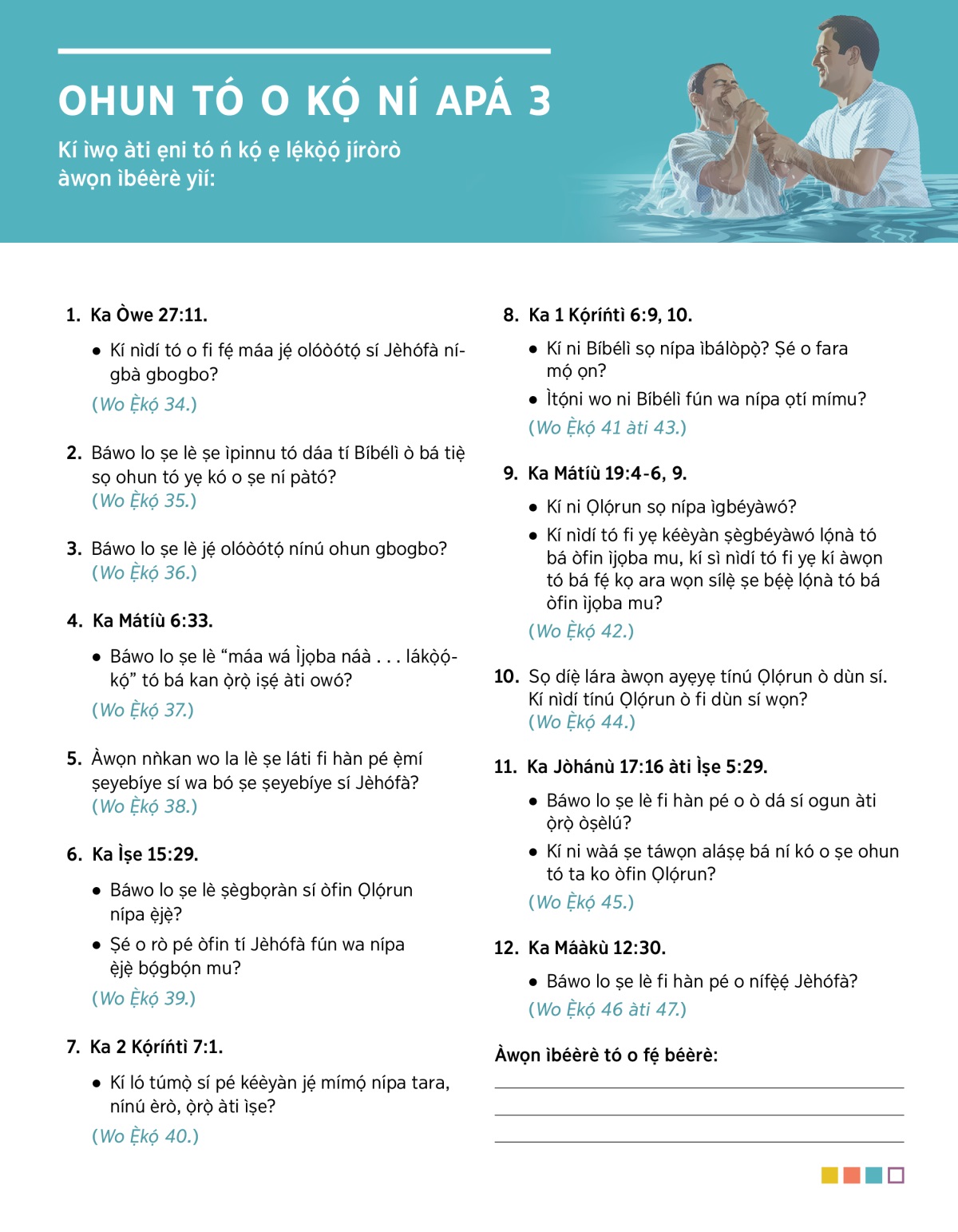 Kí ìwọ àti ẹni tó ń kọ́ ẹ lẹ́kọ̀ọ́ jíròrò àwọn ìbéèrè yìí: