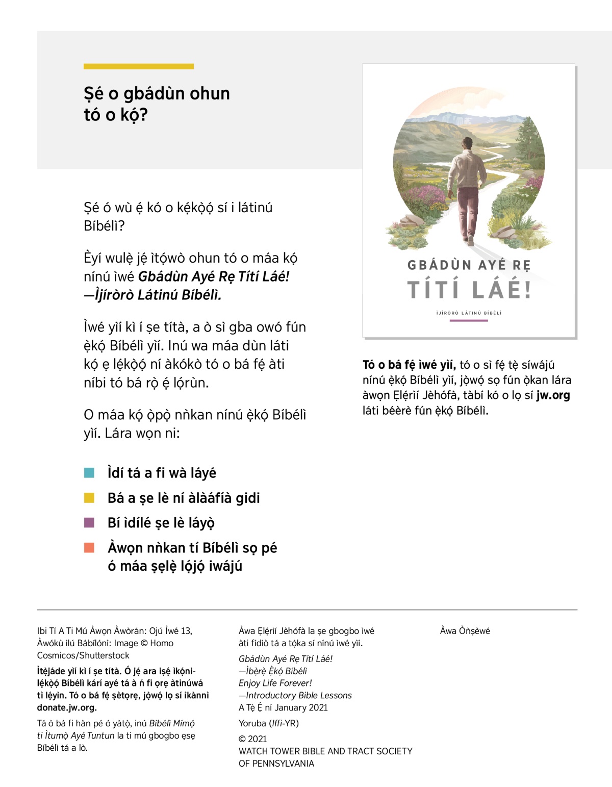 Tó o bá fẹ́ ìwé yìí, tó o sì fẹ́ tẹ̀ síwájú nínú ẹ̀kọ́ Bíbélì yìí, jọ̀wọ́ sọ fún ọ̀kan lára àwọn Ẹlẹ́rìí Jèhófà, tàbí kó o lọ sí jw.org láti béèrè fún ẹ̀kọ́ Bíbélì.