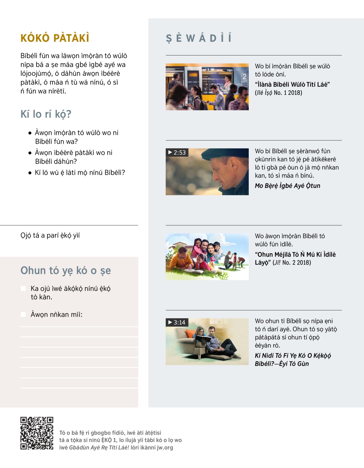 A ò fi ìwé yìí rọ́pò Bíbélì o. Kàkà bẹ́ẹ̀, ńṣe ló máa jẹ́ kí ìwọ fúnra ẹ lè fara balẹ̀ kẹ́kọ̀ọ́ Bíbélì. Torí náà, a rọ̀ ẹ́ pé kó o ka àwọn ẹsẹ Bíbélì tó wà ní ẹ̀kọ́ kọ̀ọ̀kan, kó o sì fi wéra pẹ̀lú ohun tó ò ń kọ́.