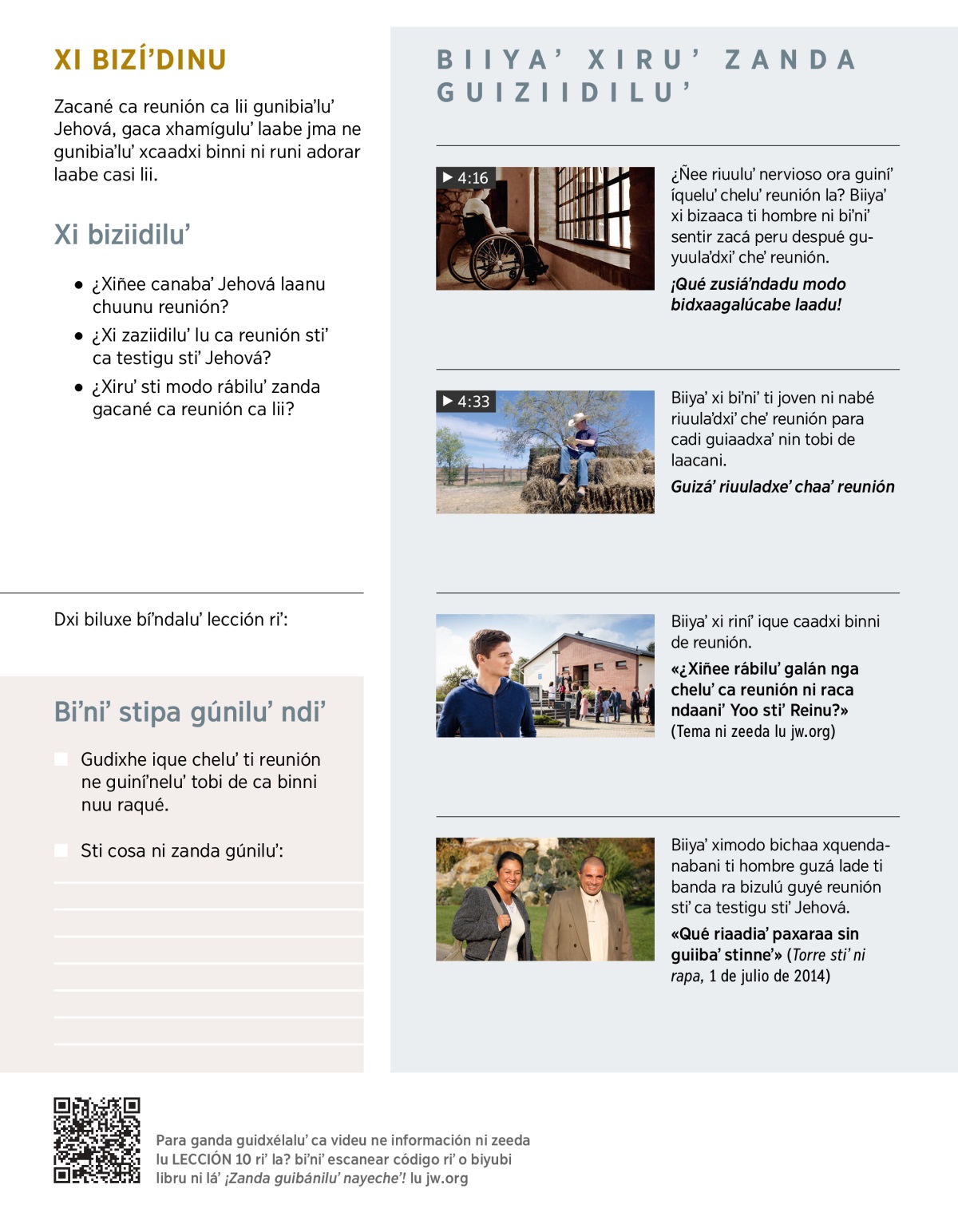 Lu ca reunión rápadu rusiénecabe laadu xiixa tema ni zeeda lu Biblia, ruluíʼcabe laadu ximodo gusíʼdidu ne ridúʼyadu videu. Ora ruzulú ni ne ora riluxe ni riuundaʼ ti canción ne raca ti oración.