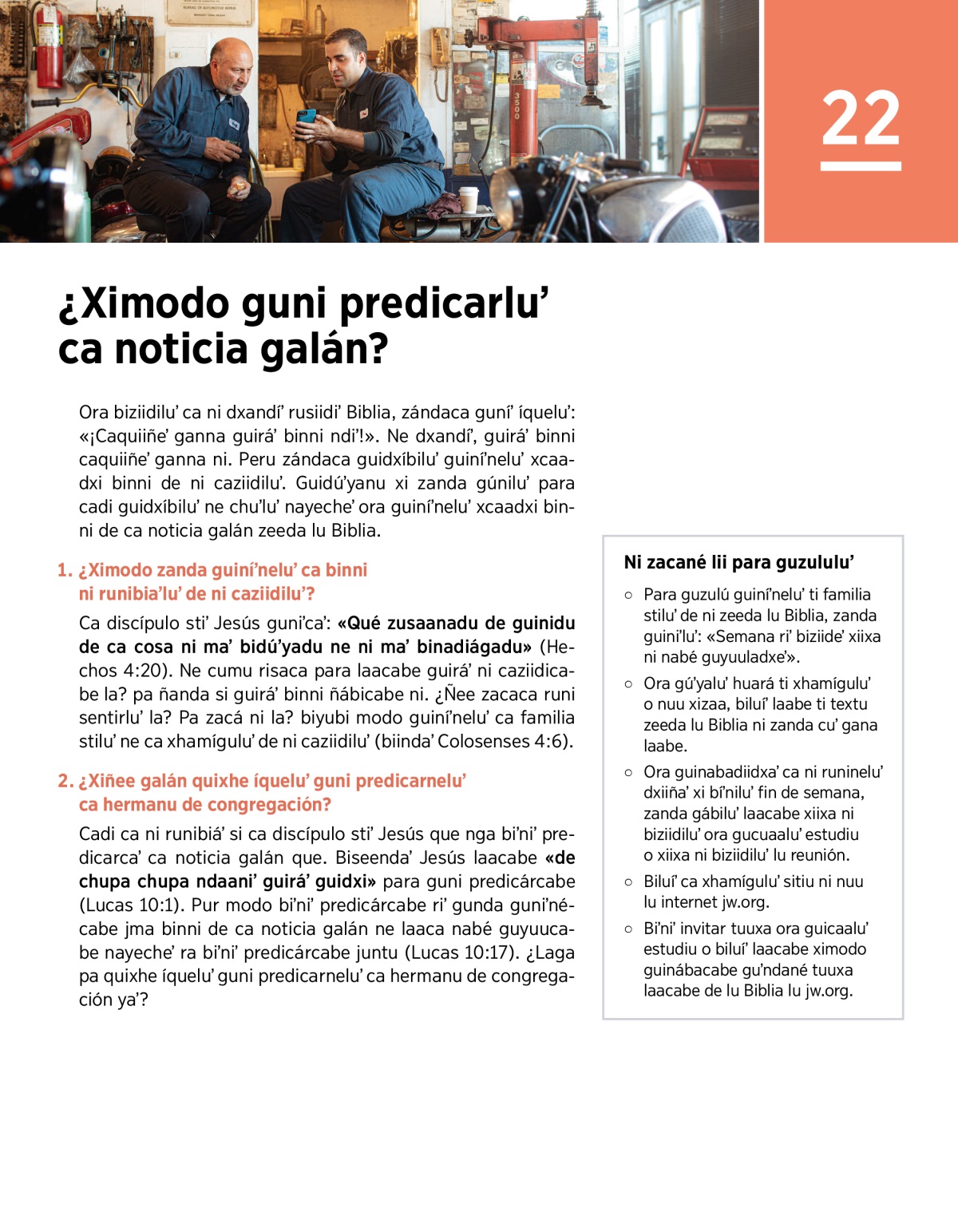 Cadi ca ni runibiáʼ si ca discípulo stiʼ Jesús que nga biʼniʼ predicarcaʼ ca noticia galán que. Biseendaʼ Jesús laacabe «de chupa chupa ndaaniʼ guiráʼ guidxi» para guni predicárcabe (Lucas 10:1). Pur modo biʼniʼ predicárcabe riʼ gunda guniʼnécabe jma binni de ca noticia galán ne laaca nabé guyuucabe nayecheʼ ra biʼniʼ predicárcabe juntu (Lucas 10:17). ¿Laga pa quixhe íqueluʼ guni predicarneluʼ ca hermanu de congregación yaʼ?