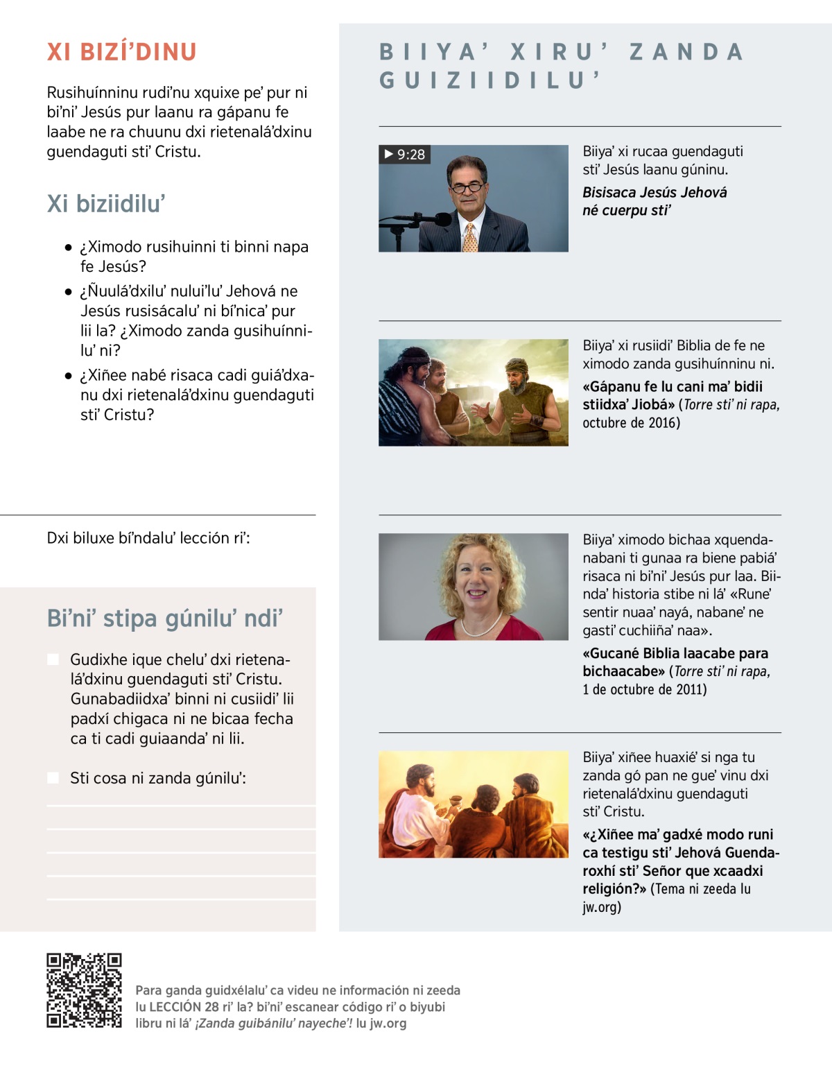 Guidúʼyanu chonna modo zanda gusihuínninu rudiʼnu xquixe peʼ Jehová ne Jesús pur guendarannaxhii ni bisihuínnicaʼ laanu. Ne guidúʼyanu pabiáʼ risaca dxi rietenaláʼdxinu guendaguti stiʼ Cristu.