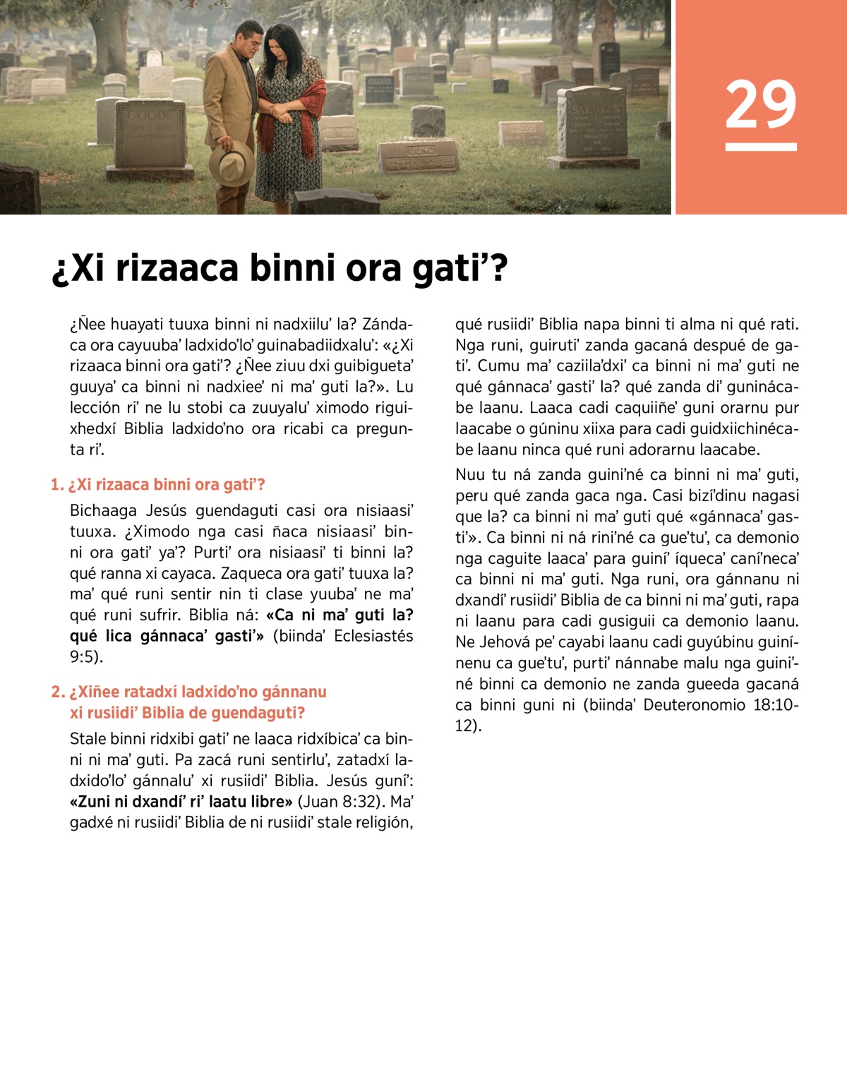 Bichaaga Jesús guendaguti casi ora nisiaasiʼ tuuxa. ¿Ximodo nga casi ñaca nisiaasiʼ binni ora gatiʼ yaʼ? Purtiʼ ora nisiaasiʼ ti binni la? qué ranna xi cayaca. Zaqueca ora gatiʼ tuuxa la? maʼ qué runi sentir nin ti clase yuubaʼ ne maʼ qué runi sufrir. Biblia ná: «Ca ni maʼ guti la? qué lica gánnacaʼ gastiʼ» (biindaʼ Eclesiastés 9:5).