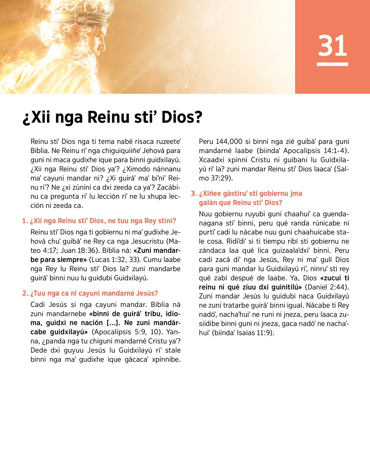Reinu stiʼ Dios nga ti tema nabé risaca ruzeeteʼ Biblia. Ne Reinu riʼ nga chiguiquiiñeʼ Jehová para guni ni maca gudixhe ique para binni guidxilayú. ¿Xii nga Reinu stiʼ Dios yaʼ? ¿Ximodo nánnanu maʼ cayuni mandar ni? ¿Xi guiráʼ maʼ biʼniʼ Reinu riʼ? Ne ¿xi zúnini ca dxi zeeda ca yaʼ? Zacábinu ca pregunta riʼ lu lección riʼ ne lu xhupa lección ni zeeda ca.