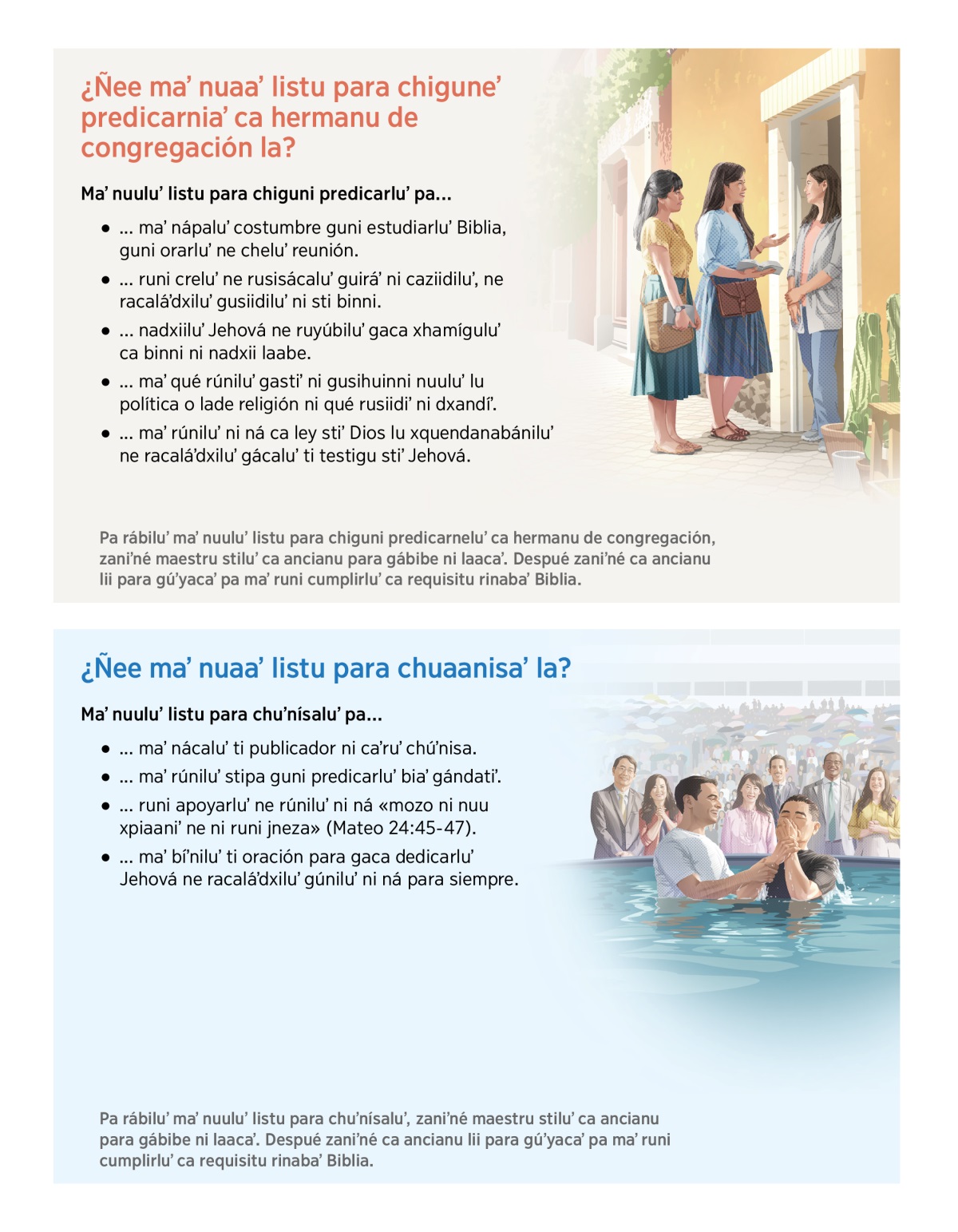 Pa rábiluʼ maʼ nuuluʼ listu para chiguni predicarneluʼ ca hermanu de congregación, zaniʼné maestru stiluʼ ca ancianu para gábibe ni laacaʼ. Despué zaniʼné ca ancianu lii para gúʼyacaʼ pa maʼ runi cumplirluʼ ca requisitu rinabaʼ Biblia.