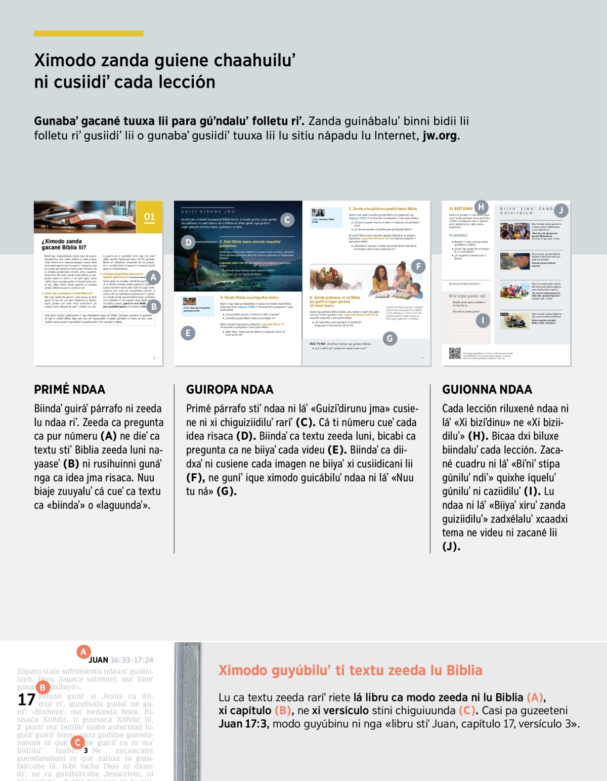 Lu ca textu zeeda raríʼ riete lá libru ca modo zeeda ni lu Biblia (A), xi capítulo (B), ne xi versículo stini chiguiuunda (C). Casi pa guzeeteni Juan 17:3, modo guyúbinu ni nga «libru stiʼ Juan, capítulo 17, versículo 3».