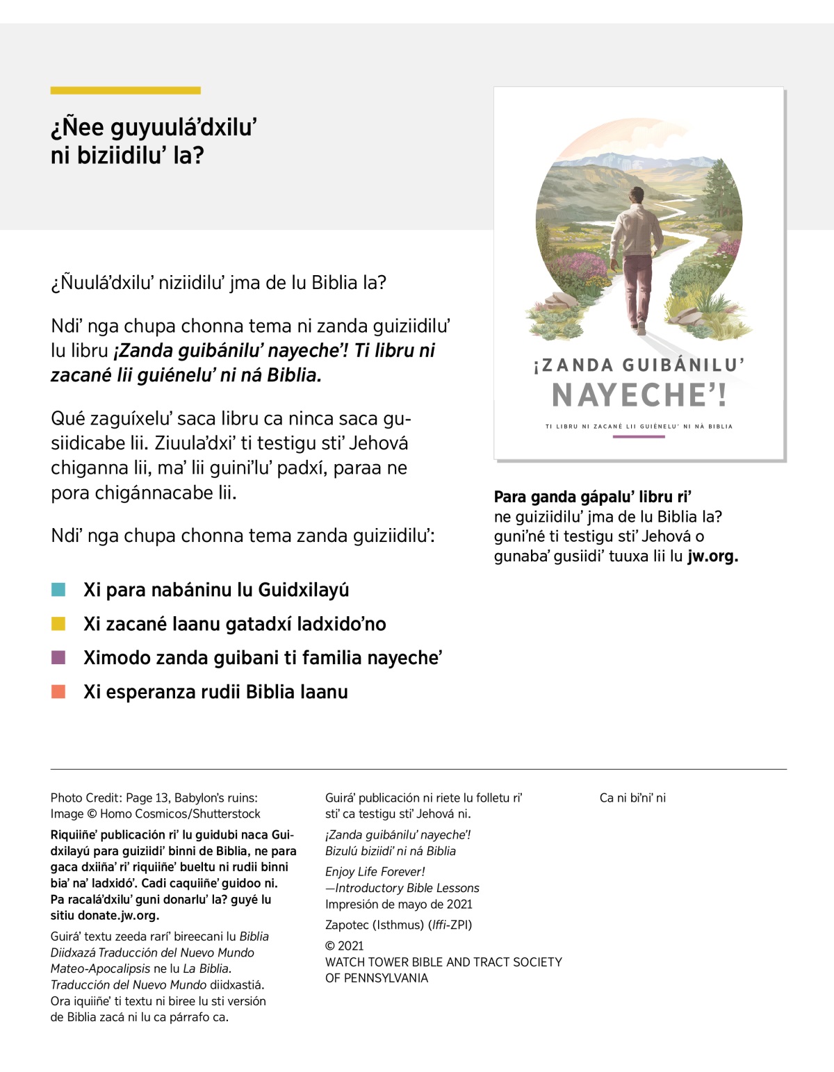 Ndiʼ nga chupa chonna tema ni zanda guiziidiluʼ lu libru ¡Zanda guibániluʼ nayecheʼ! Ti libru ni zacané lii guiéneluʼ ni ná Biblia.